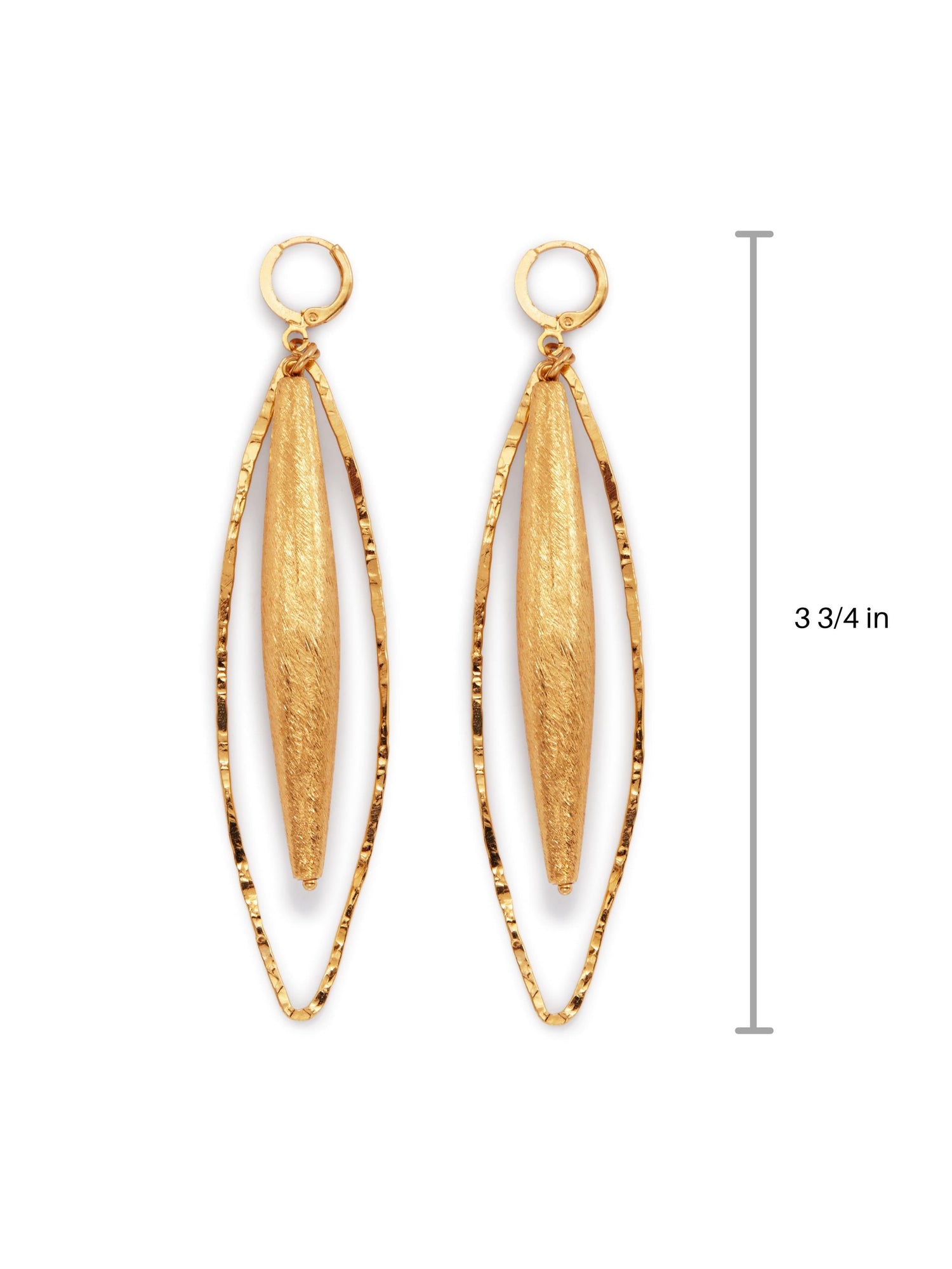 These earrings are made from 18K gold-plated material and feature large 6cm x 9.5mm hollow brushed blimp beads. They have a 3.75-inch drop and a leverback fastening.