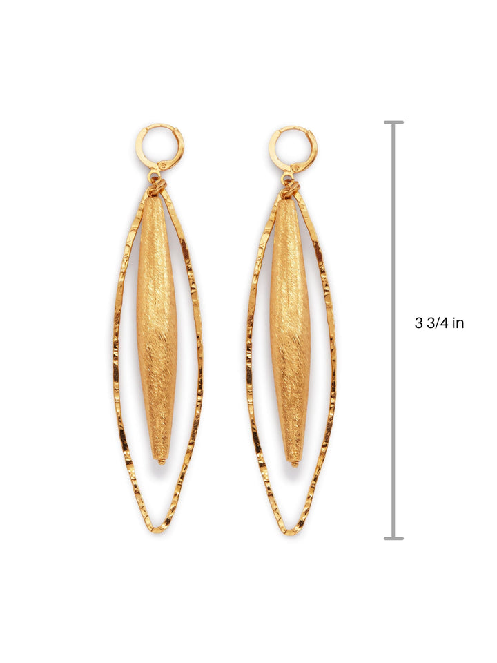 These Zeppelin Hailey Gold Leverback Earrings by Jaredjamin will take you into the stratosphere with their dramatic and slim design. These elegant earrings feature a large, hollow brushed blimp-shaped bead, all finished in 18K gold plating. Their unique and luxurious look makes them perfect for adding a bold statement to your outfit, while their lightweight design ensures a comfortable fit. They are a must-have for those who love to make a dramatic statement.