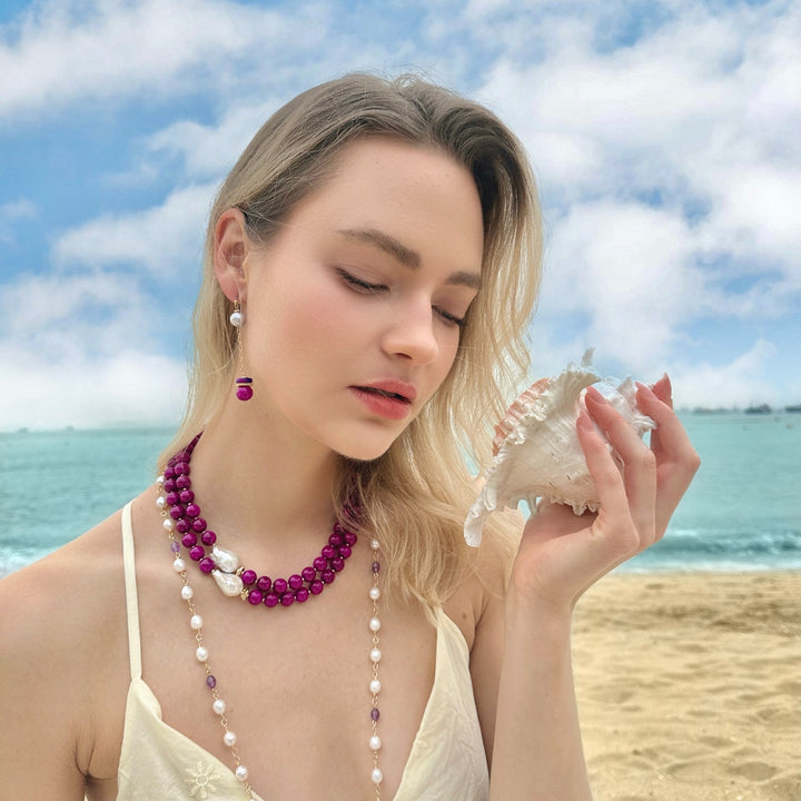 Magenta Gemstones Baroque Pearls Double Layers Necklace