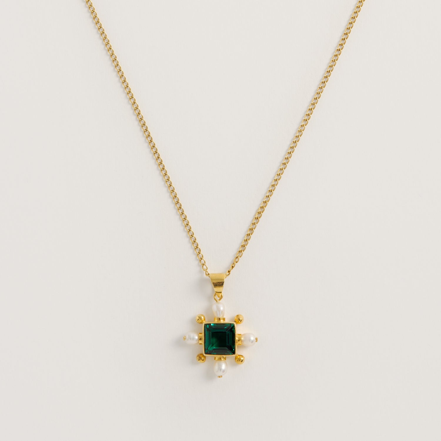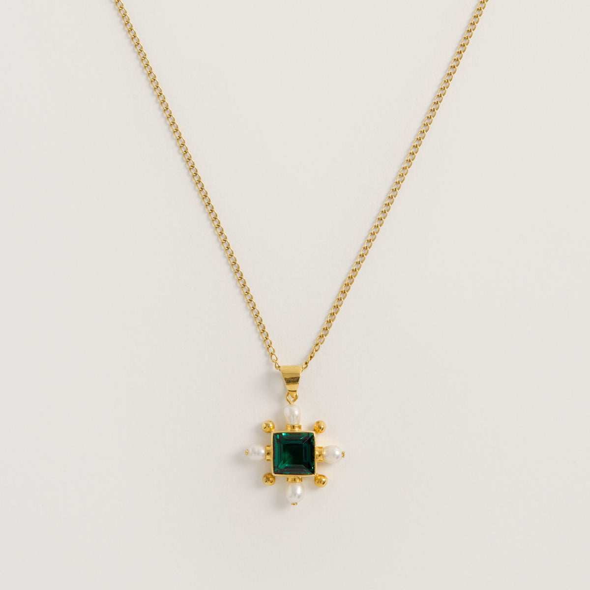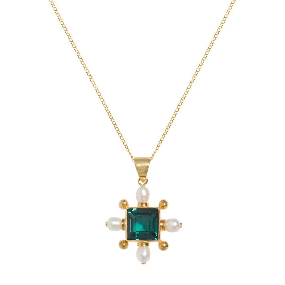 Inspired by the frivolity and glamour of 1970s New York, the glittering energy of Studio 54 and the elaborate opulence of Tudor jewellery, the Regal 54 collection exudes divine femininity. Handcrafted from 3 micron 22ct Gold Vermeil, Freshwater Pearls and a statement Green Quartz centre gemstone, the unique cross pendant is an elegant piece that embodies a regal feel. Hung from our 22ct Gold Vermeil necklace the combined statement piece elevates any outfit effortlessly, whilst reflecting the wearer’s individuality.