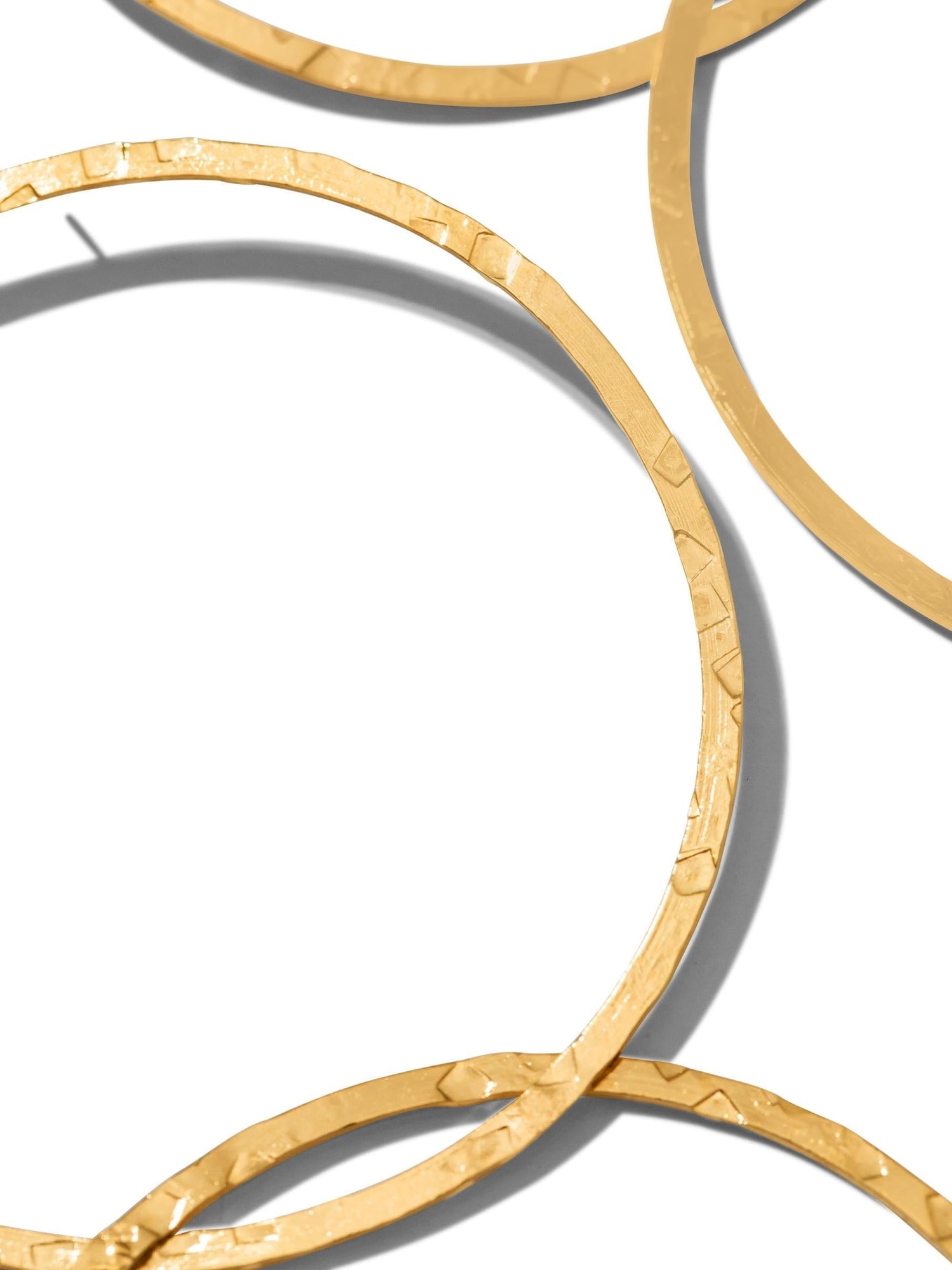 These Gold Raquel Dangle Hoop Post Earrings by Jaredjamin are a bold yet lightweight accessory that adds a touch of subtle sophistication to any look. The generously sized circular design features a refined hammered finish that shines beautifully in 18K gold plate. These earrings are designed to sway gracefully from their post fastenings, creating a captivating and elegant allure.