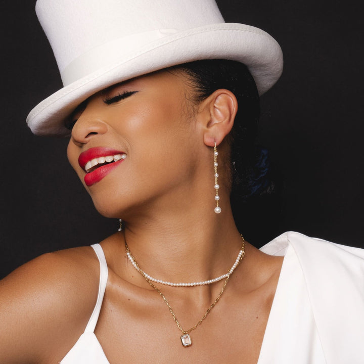 This elegantly layered white topaz and pearl necklace is set in 18ct gold plated 925 sterling silver. This necklace measures 38cm with a 5cm extender and holds an extra layered paperclip chain holding a sparkling 8x10mm octagon cut white topaz stone. Life is a dance, so do it in style. Throw on these inspirational jewels, come together and let no one stop you.