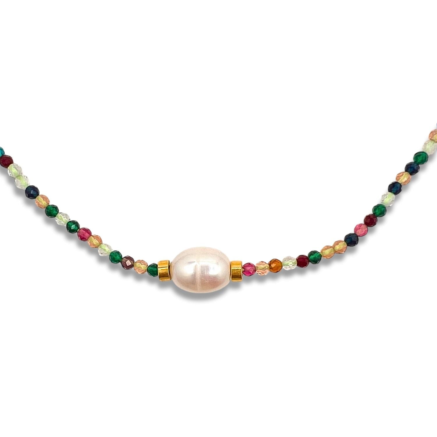This necklace features sparkling 2x3mm multi-colored faceted beads and a 12x10mm oval freshwater pearl. It has a lobster clasp and a 2-inch extender.