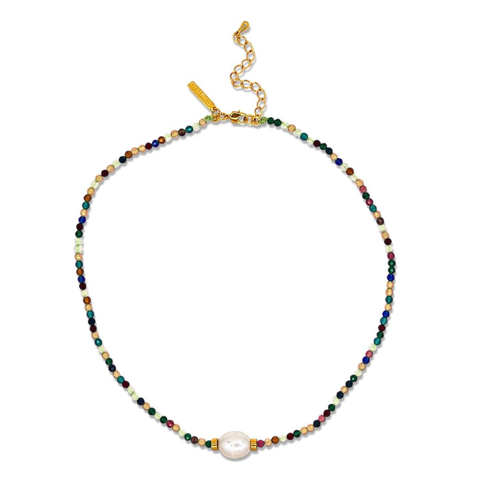 This Rowan Necklace by Jaredjamin is your go-to for playful layering fun. It features sparkling multi-colored faceted beads paired with a classic oval freshwater pearl. The lobster clasp and 2-inch extender allow you to easily mix, match, and adjust your style. This necklace is a vibrant and versatile accessory perfect for adding a pop of color and a touch of elegance to any look.