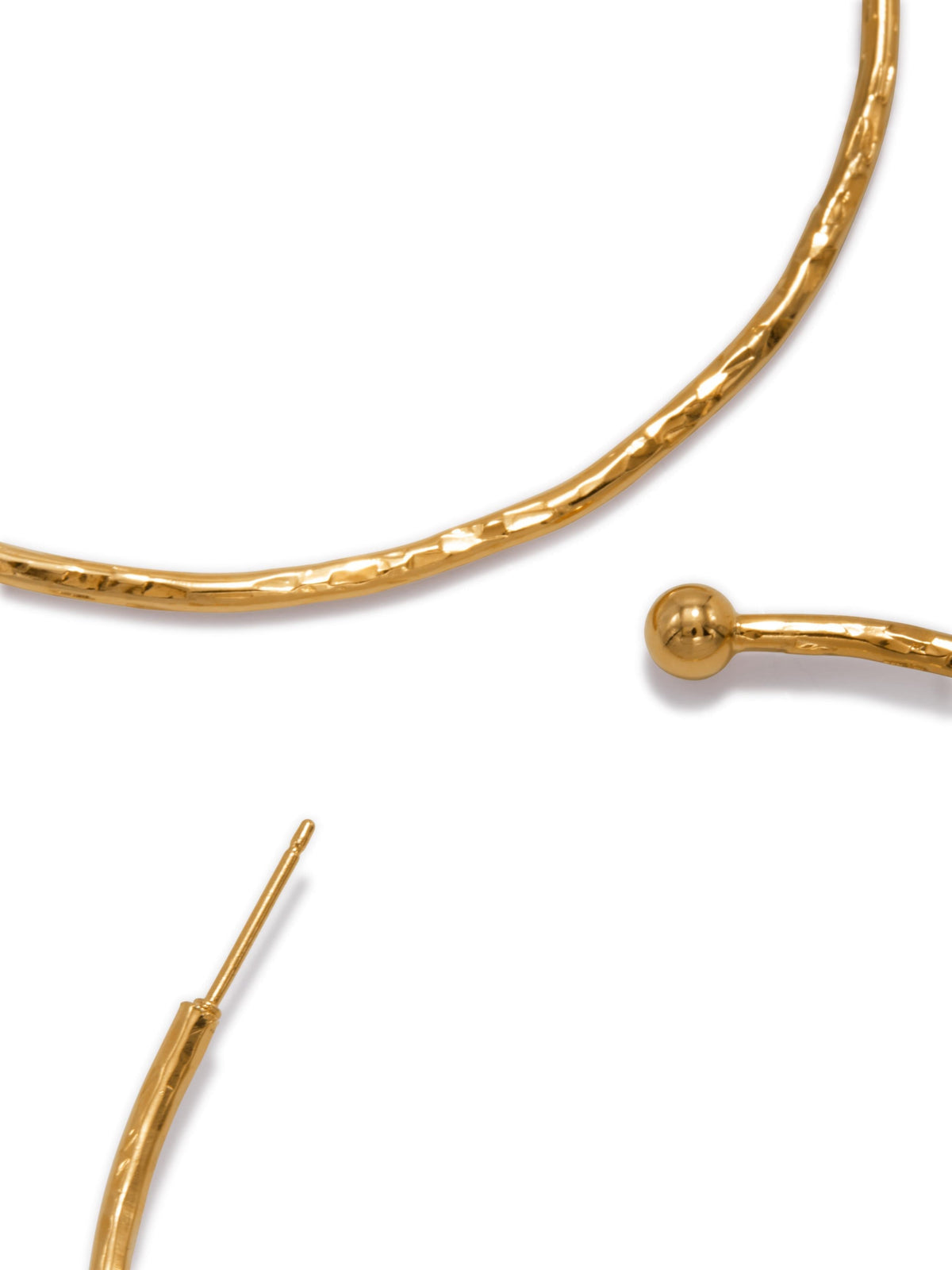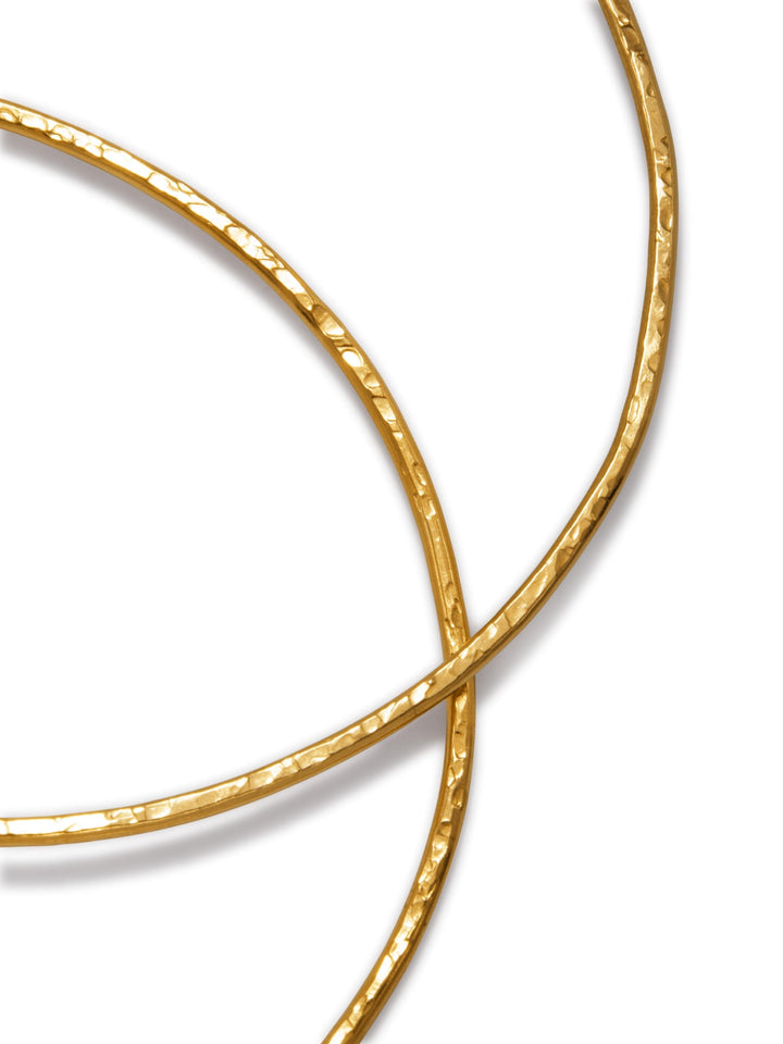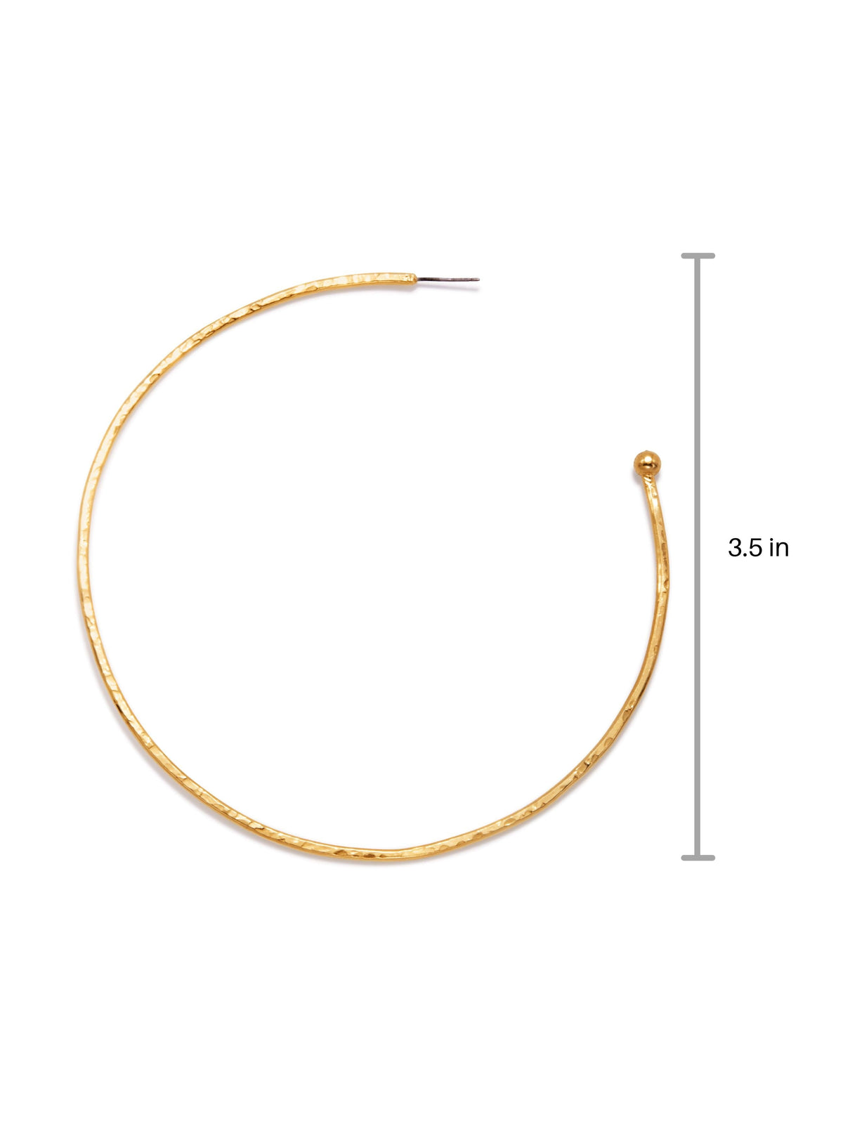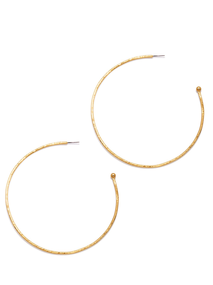 These hoop earrings are meticulously hammered and finished in 18K gold plating. They measure 3.5 inches (9 cm).