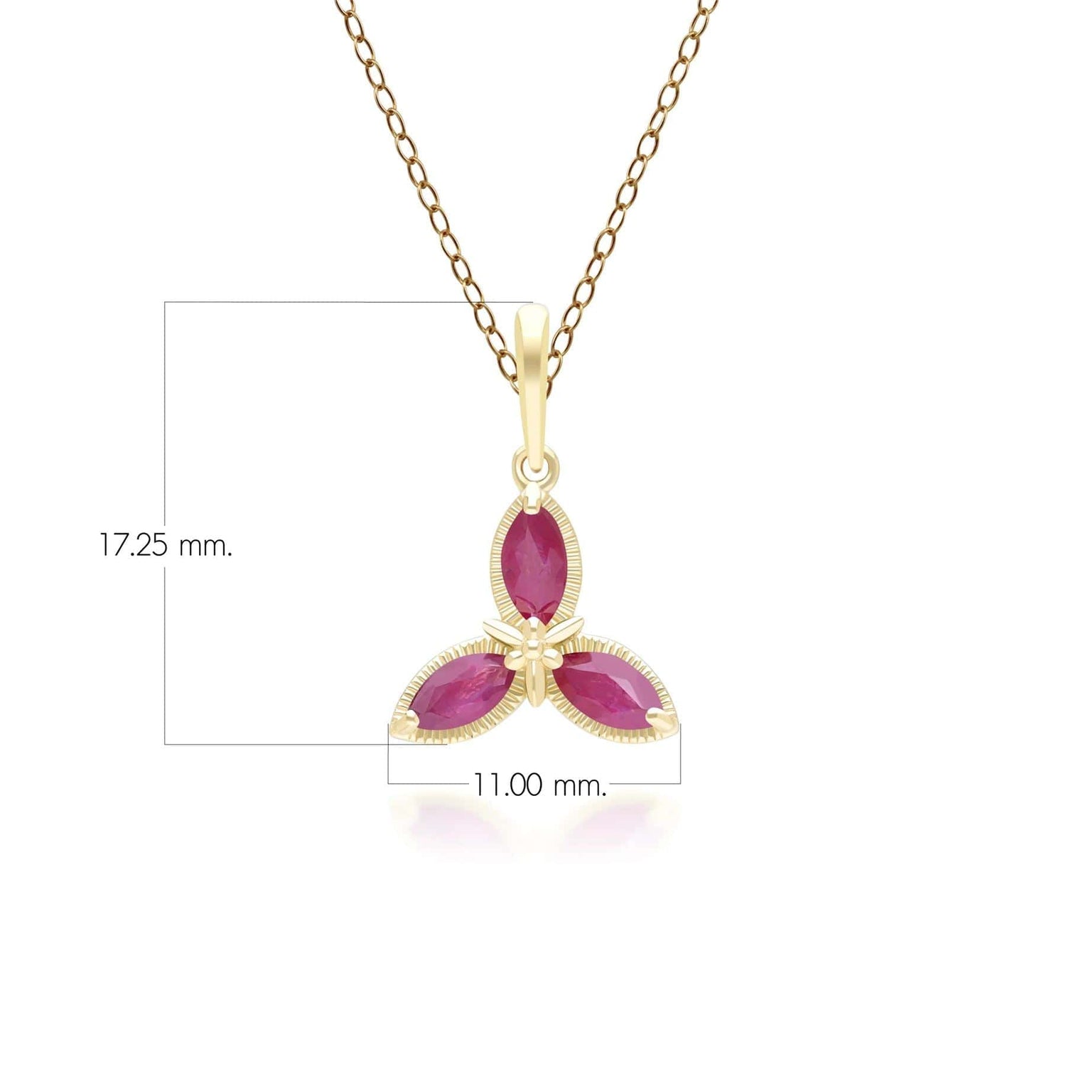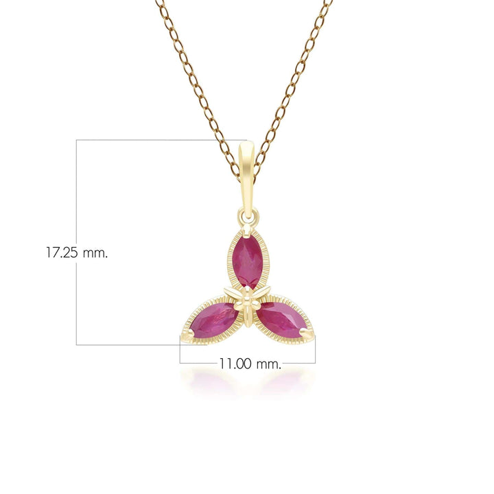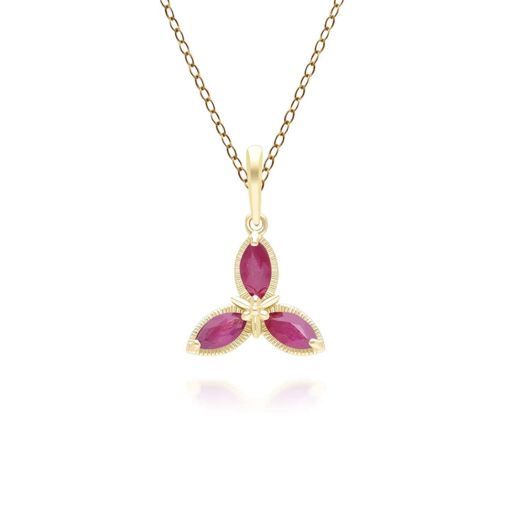A Stunning Floral Marquise Ruby Pendant Necklace in 9ct Yellow Gold. A gemstone of passion, the ruby signifies desire and success and is the perfect gift from a loving partner. As a birthstone, Ruby represent July birthdays. Discover Gemondo's classic jewellery with a range of timeless designs set with natural gemstones. Find elegant gemstone rings and occasion jewellery pieces that never go out of style.
