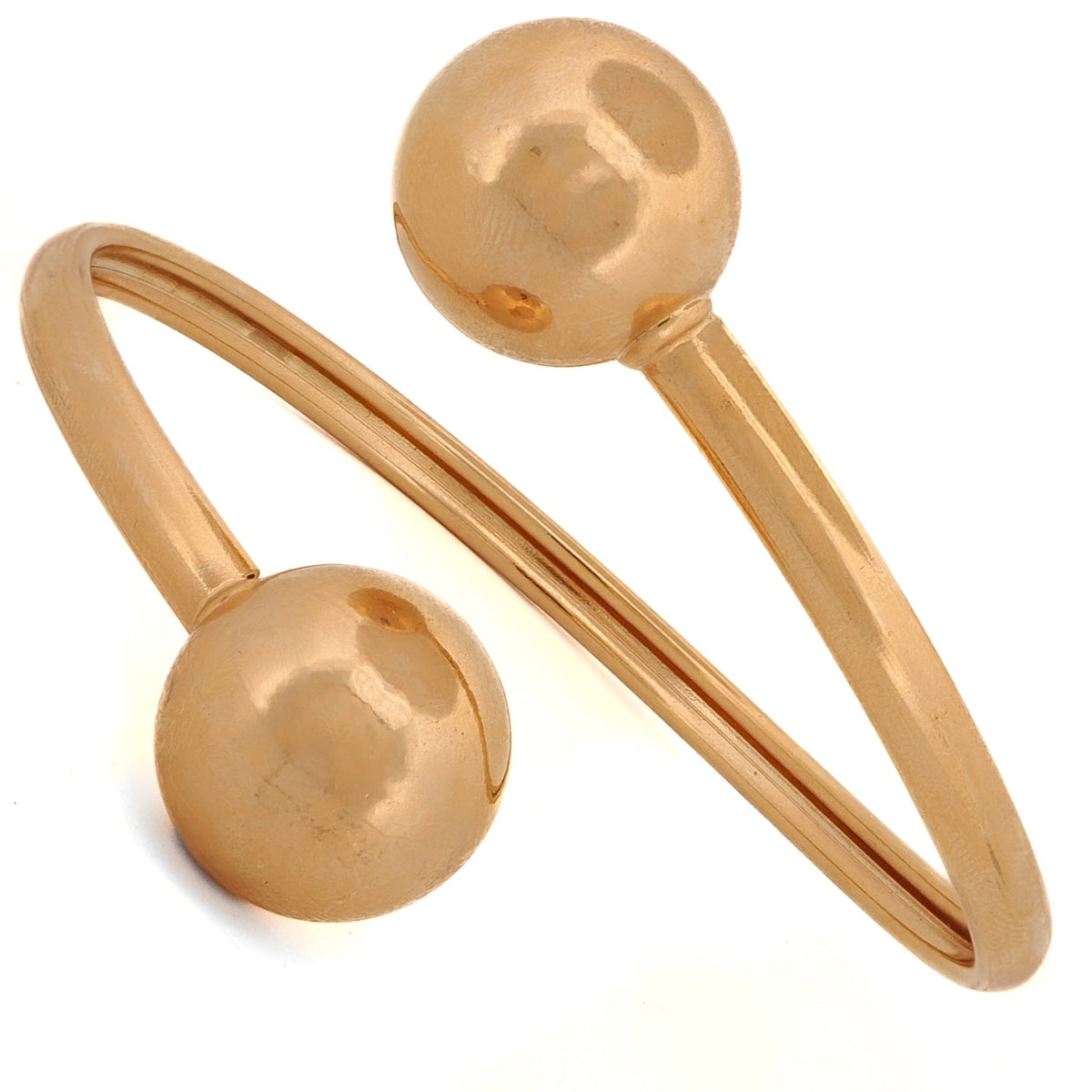 This Dual Orb Gold Cuff Bracelet by Ebru Jewelry is a sleek and elegant accessory that adds a touch of sophistication to any look. Crafted with 24k gold plating, this lightweight bracelet features a minimalist design with two polished gold spheres on each end. Its refined design makes it both comfortable and stylish, perfect for everyday wear or special occasions.
