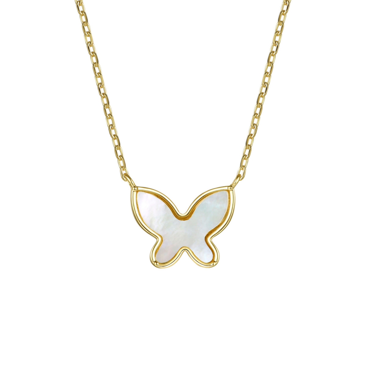 Butterflies symbolize change, happiness, and love, making them a joyful inspiration to have with you daily. A bezel set shimmering mother of pearl inlay in the shape of an abstract butterfly gives this lightweight layering necklace an eye-catching style, all beautifully crafted in 14k yellow gold plated sterling silver with a lobster clasp.