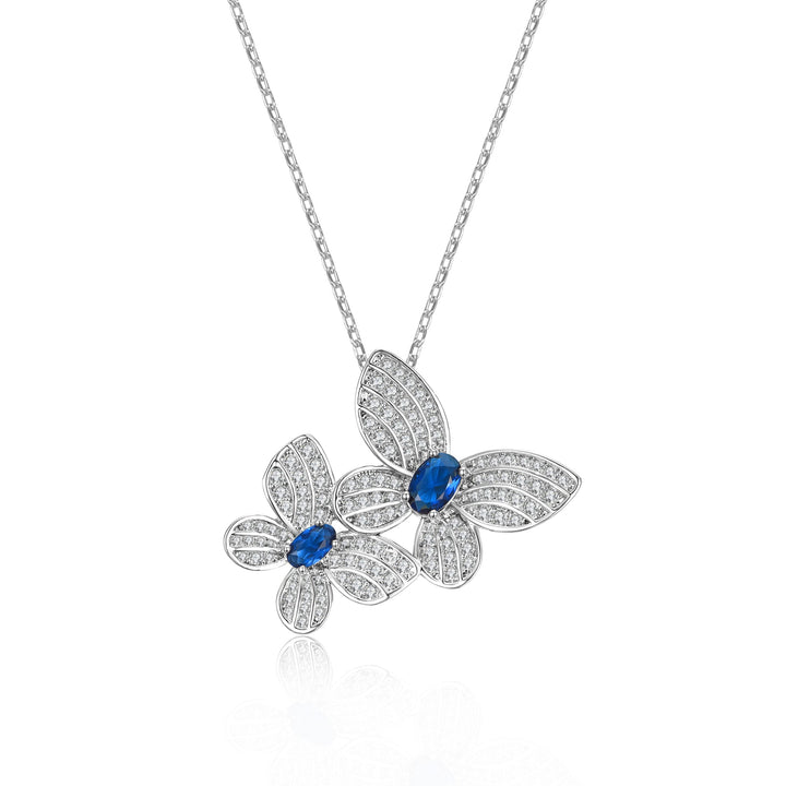 Sterling Silver White Gold Plated Blue Sapphire & Cubic Zirconia Double Fluttering Butterfly Pendant Necklace. Fly away to a joyful ambiance with this brightly polished white gold plated sterling silver necklace. Oval cut blue sapphirecubic zirconias (September birthstone) prong set in the middle of butterflies sparkling with round brilliant cut cubic zirconias pave set in a glittering display. A hidden bail and a delicate cable chain threaded through it give the butterflies the illusion they are floating when worn. A lobster clasp keeps it secure.
