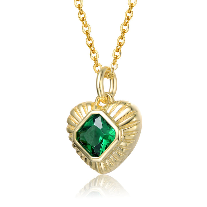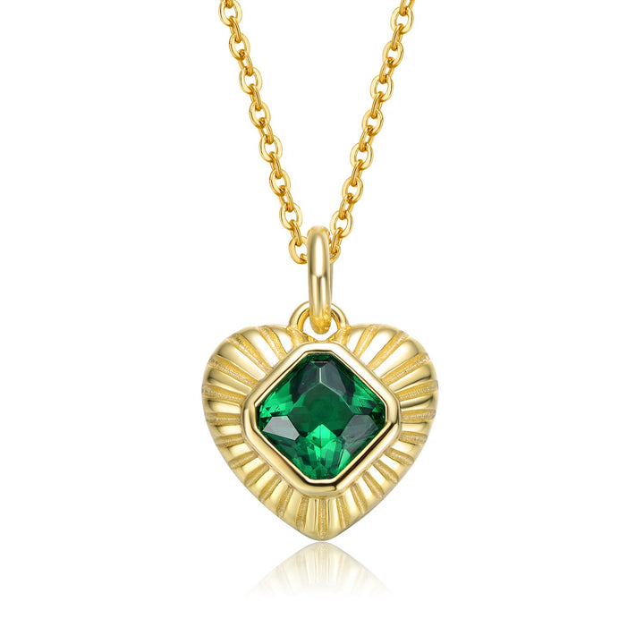 Sterling Silver Yellow Gold Plated with Emerald Cubic Zirconia Sunray Heart Pendant Necklace. Elevate your layering necklace collection or wear this sterling Silver Yellow Gold plated pendant necklace on its own as the main focal point. A square-cut emerald-like cubic zirconia bezel set in the center of a heart pendant offsets the scalloped sunrays. A ring bail with a rolo link chain threaded through finishes the look, secured by a spring ring clasp for your convenience.