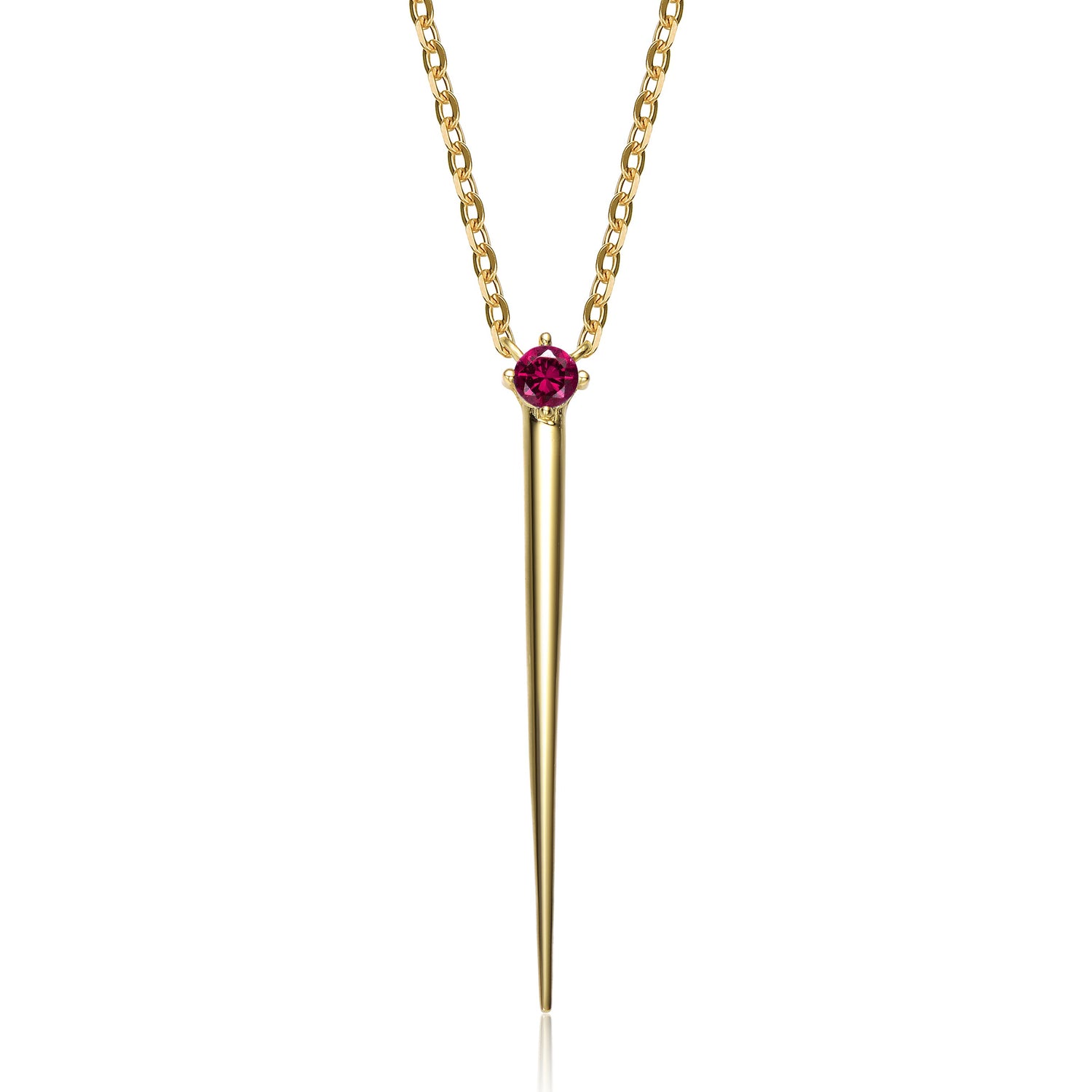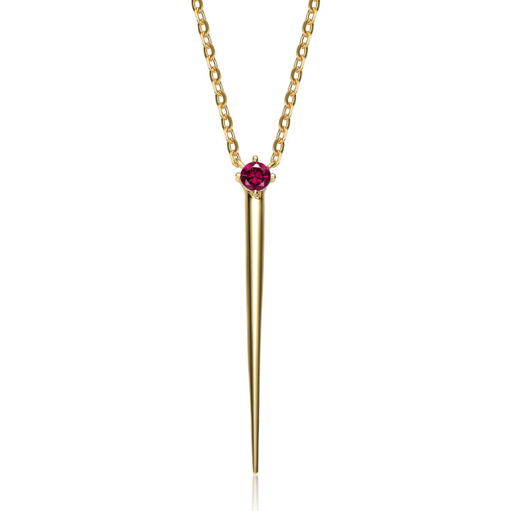 Elevate your style with this 14k gold-plated necklace. The dagger pendant features a round red cubic zirconia, adding a touch of modernity. The delicate chain and lobster clasp allow for easy layering. Available in different stone colors.