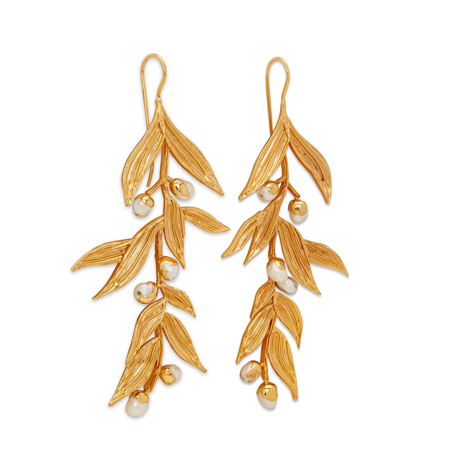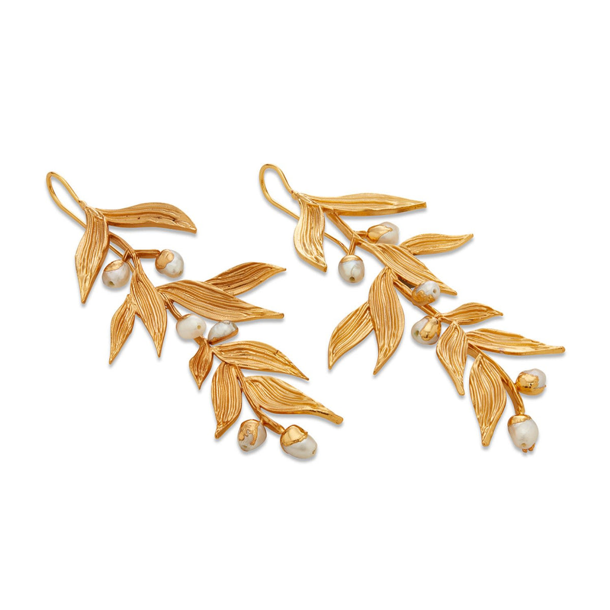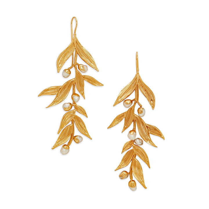 Handcrafted in 22k gold-plated brass. Accented with scattered baroque pearls. Lightweight chandelier silhouette.