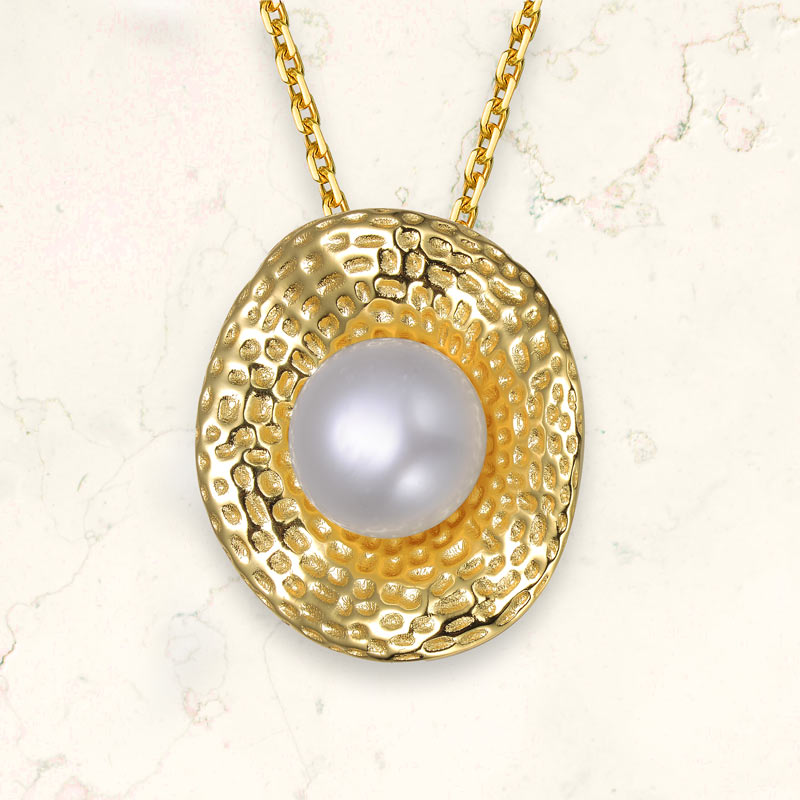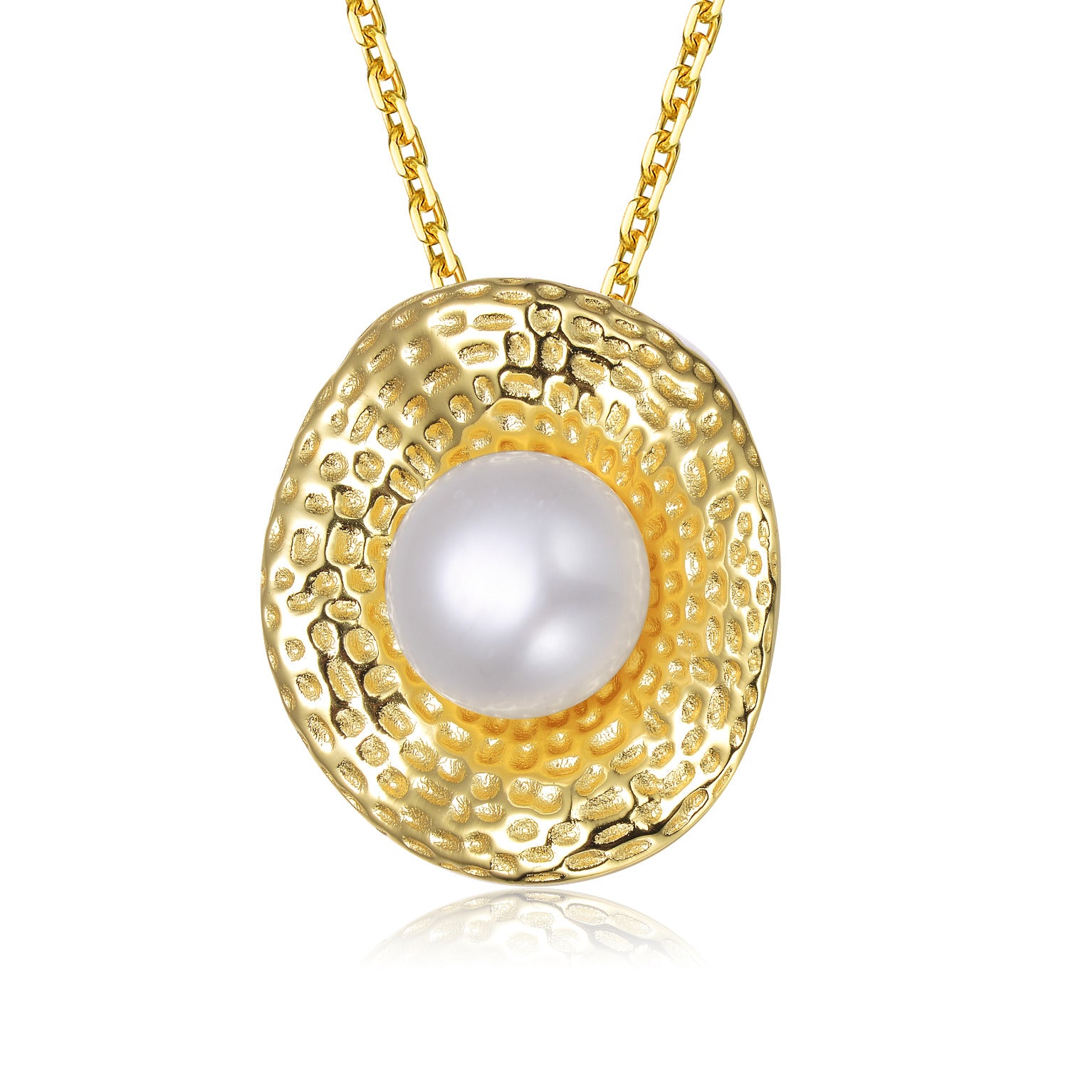 Sterling Silver Gold Plated Freshwater Pearl Hammered Pendant Necklace