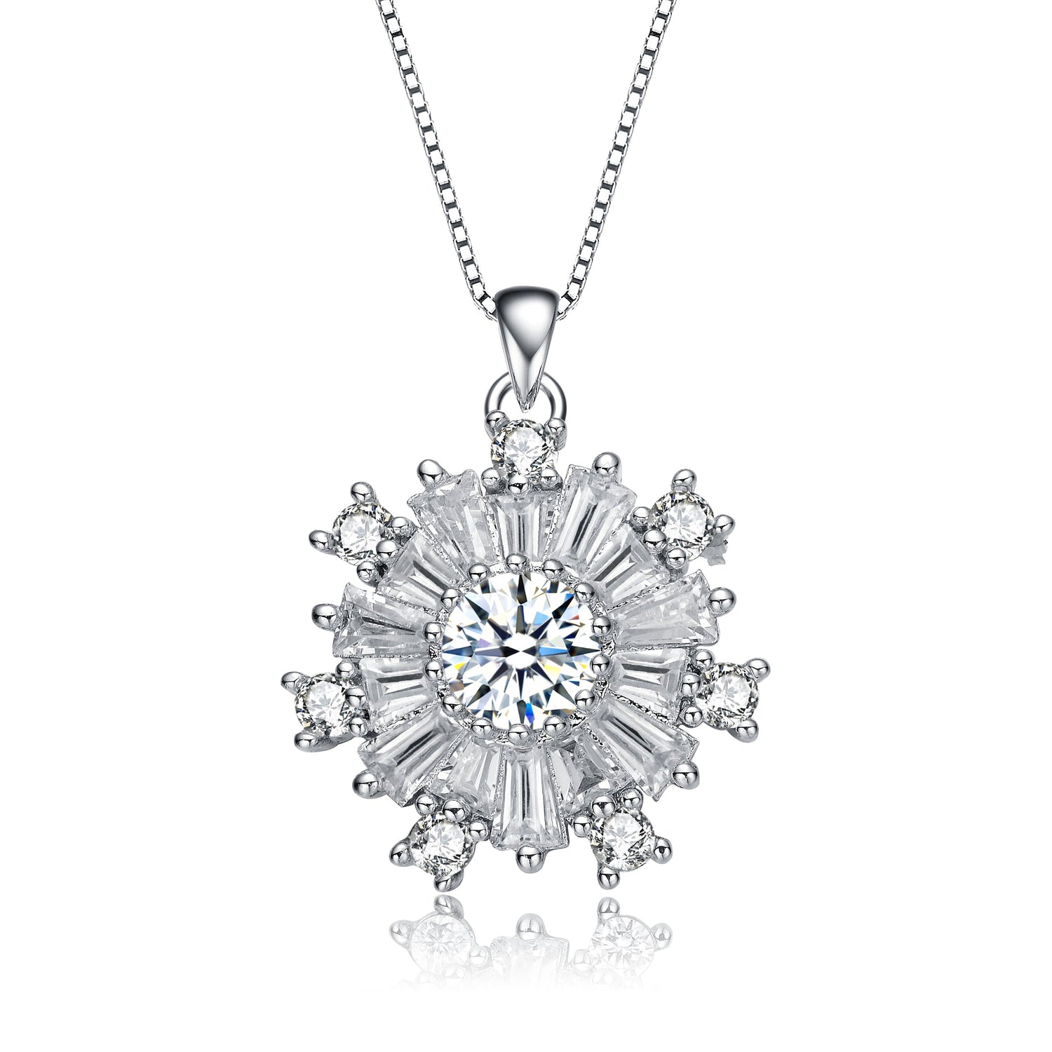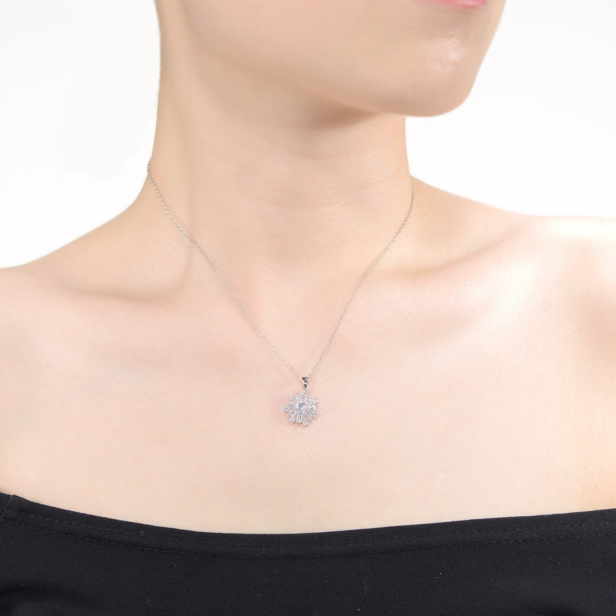 White Gold Plated with Cubic Zirconia Flower Snowflake Pendant Necklace. This ultra-glam white gold plated necklace features a glittering display of cubic zirconias prong set in a dazzling flower cluster. Round brilliant cut and baguette cut cubic zirconias in invisibly channel/prong settings give it a look of pure elegance. A tapered bail adds length to this enchanting design. A lobster clasp secures the box chain, making it ready to wear at any time. Item Should not come in contact with water.
