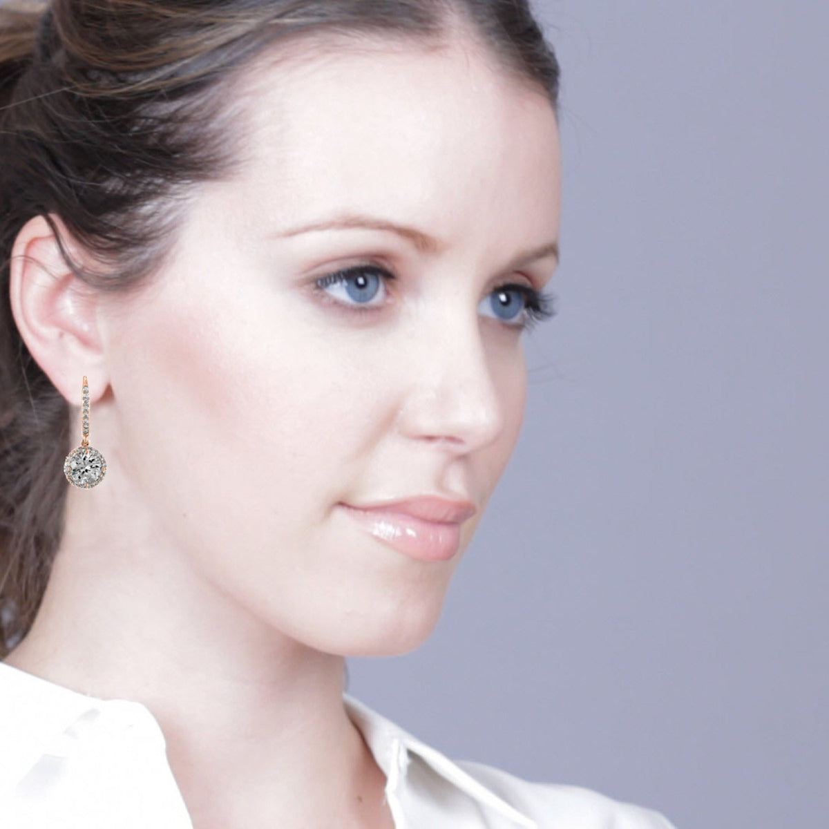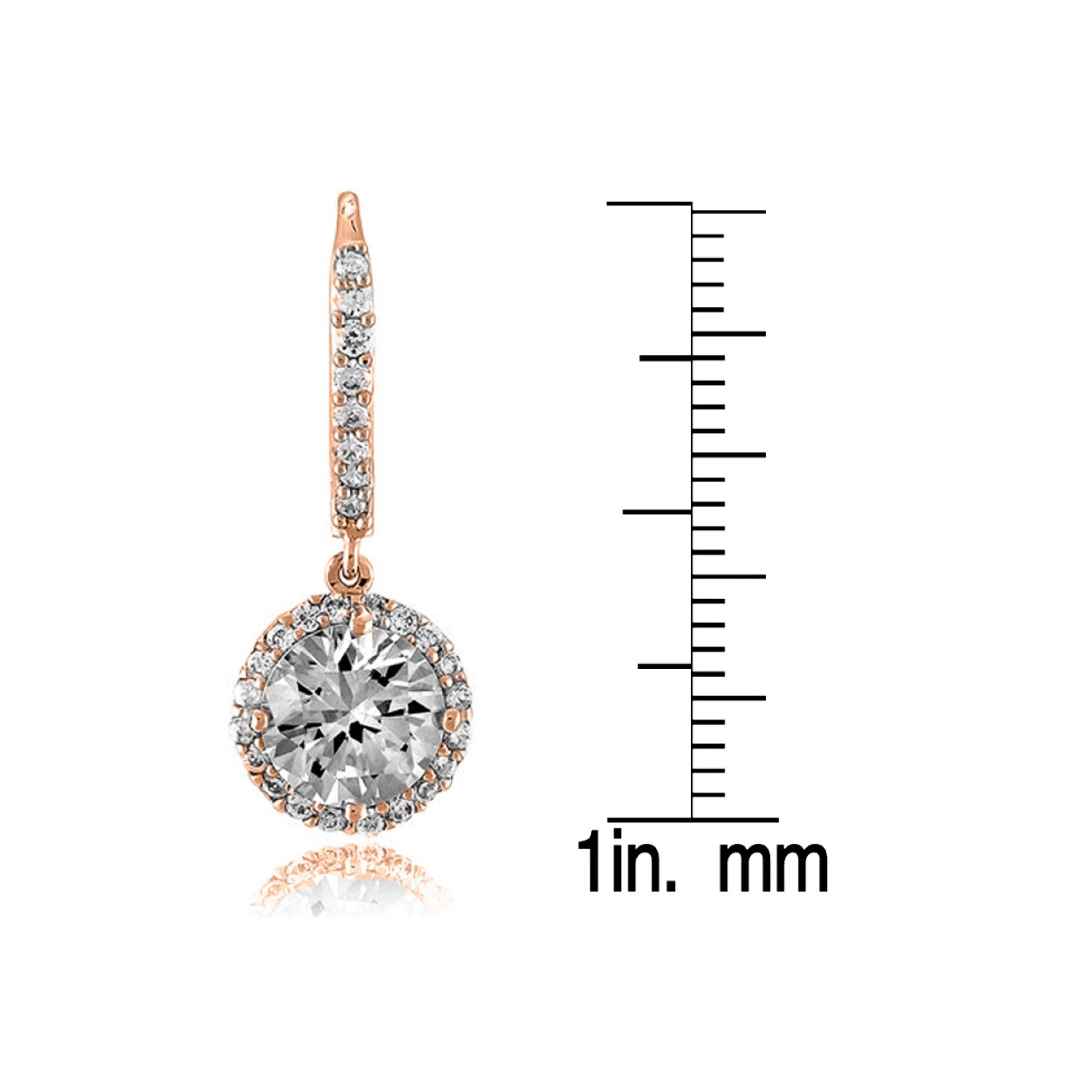 These dangling earrings are made from sterling silver with an 18K rose gold plating. They feature a clear, round cubic zirconia center stone with a halo of smaller cubic zirconia stones and a hook closure.