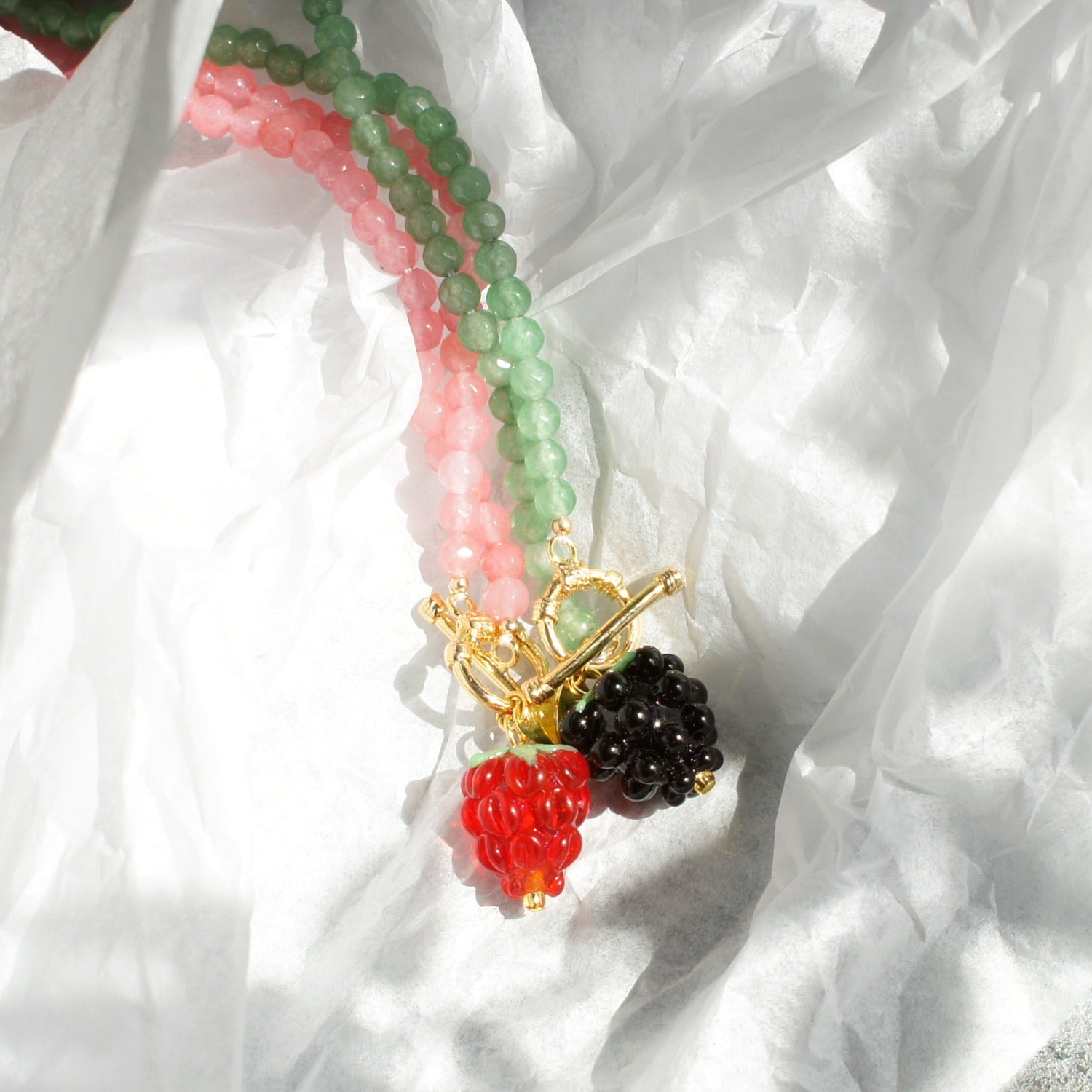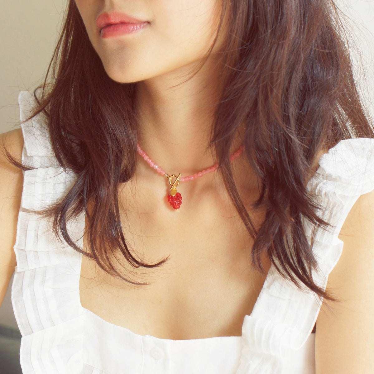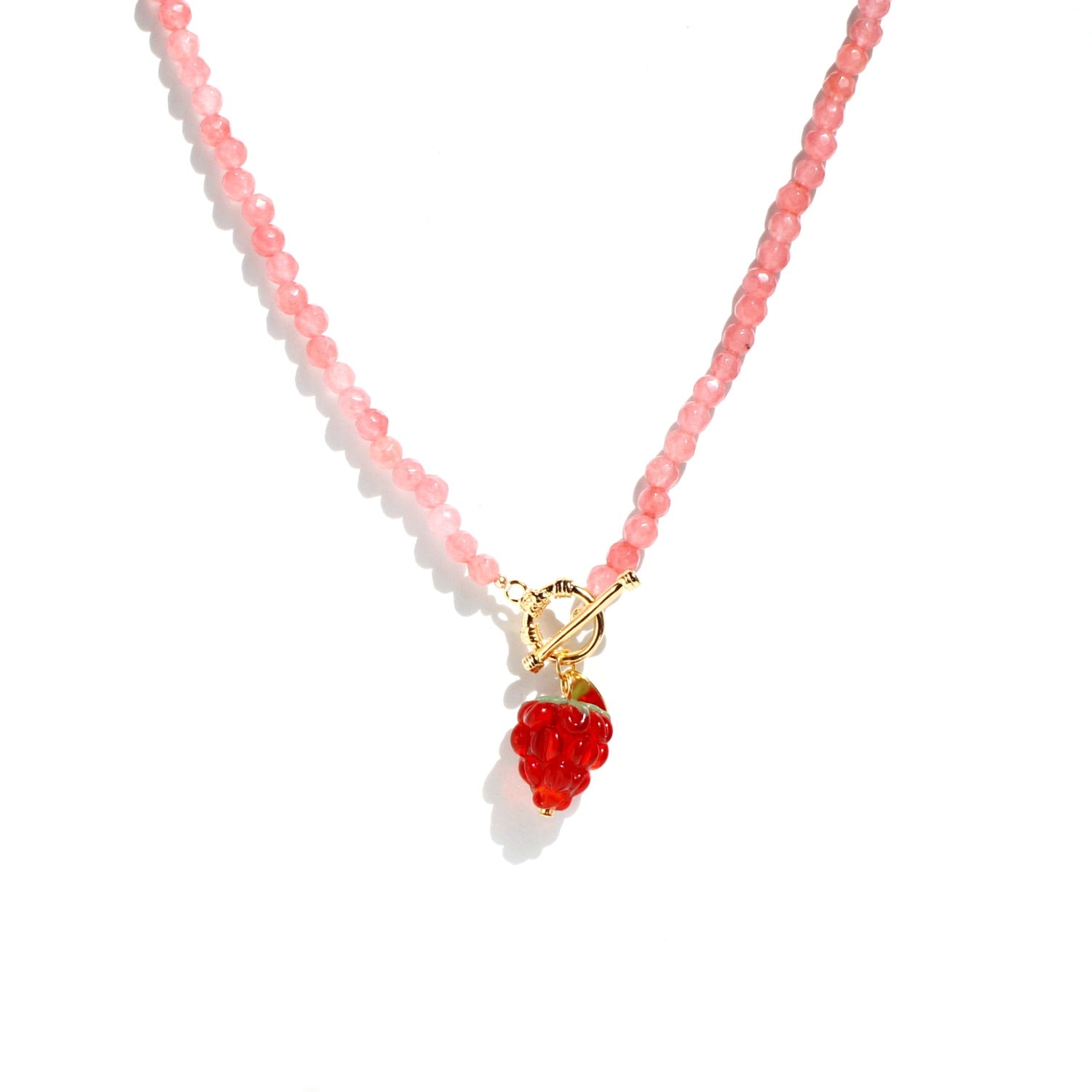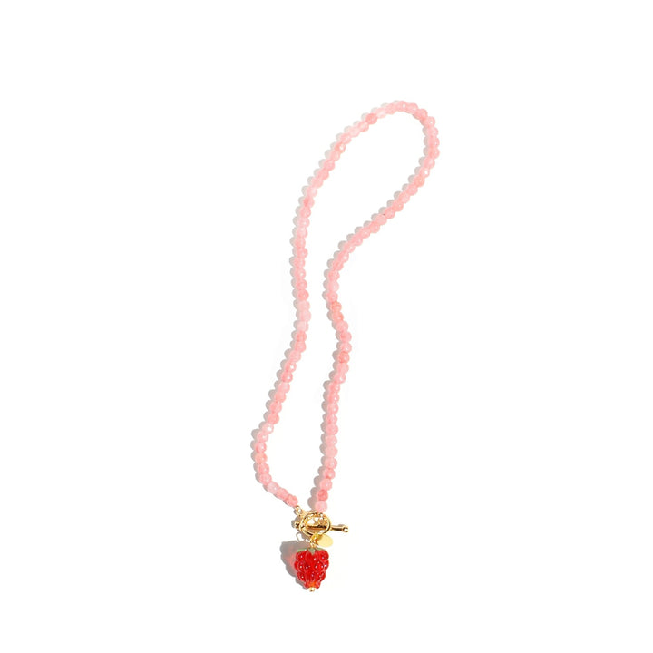 A refreshing addition to your summer outfit, this fruity necklace features a cute glass raspberry on a faceted gemstone strand. The fruit beads are handmade therefore each piece is unique.