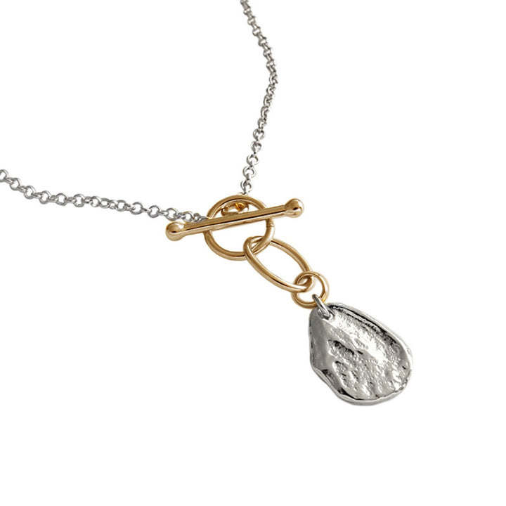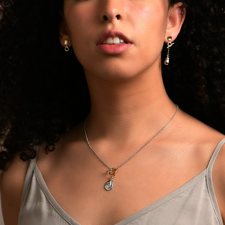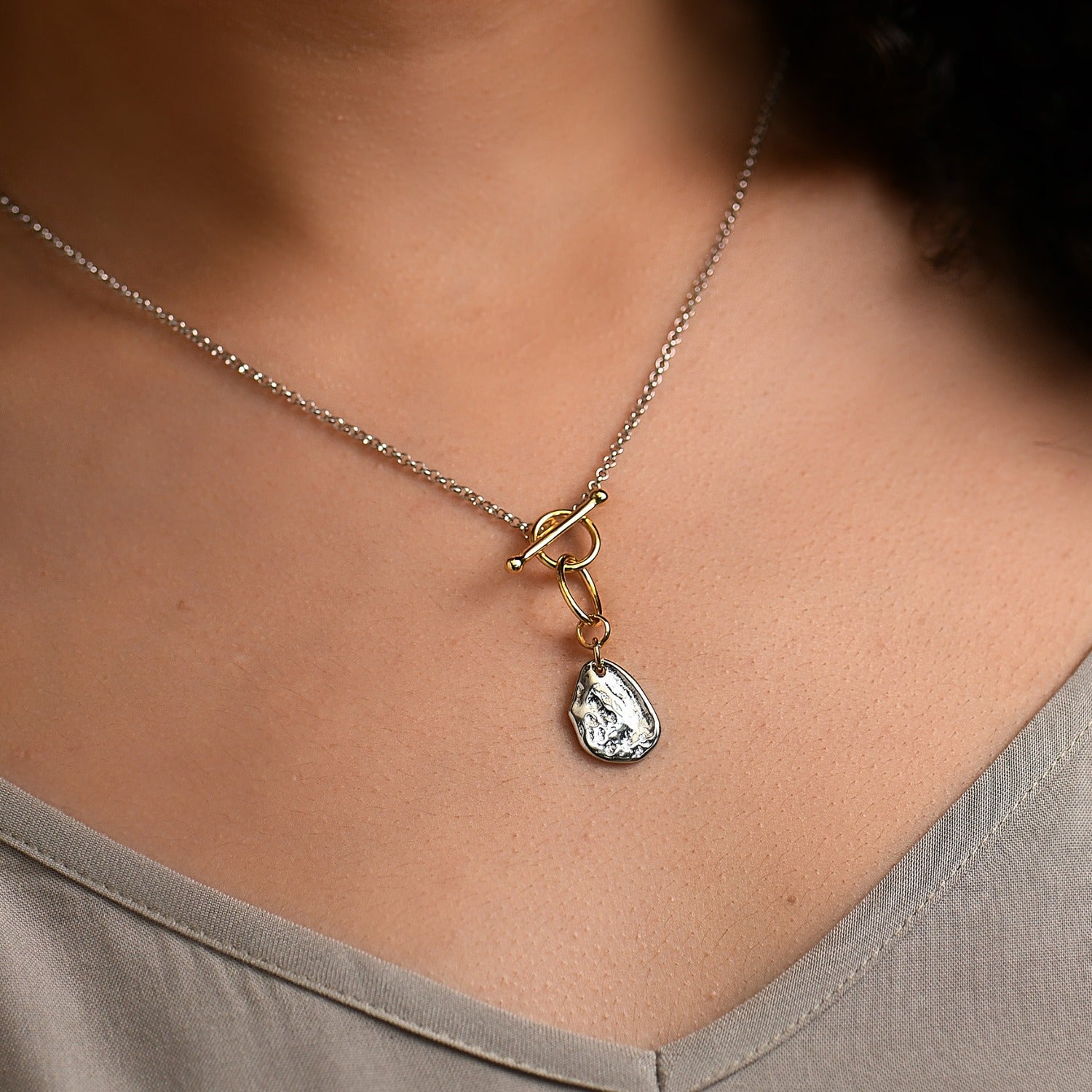 The Denarius necklace is inspired by ancient civilisations and coins. With a simple but stylish toggle clasp, designed to sit at the front rather than the back, paired with a bold mixed metal look, this necklace has all the hallmarks of a beautiful and unique piece. The nugget pendant is reminiscent of an ancient coin, which is where this piece gets its name.