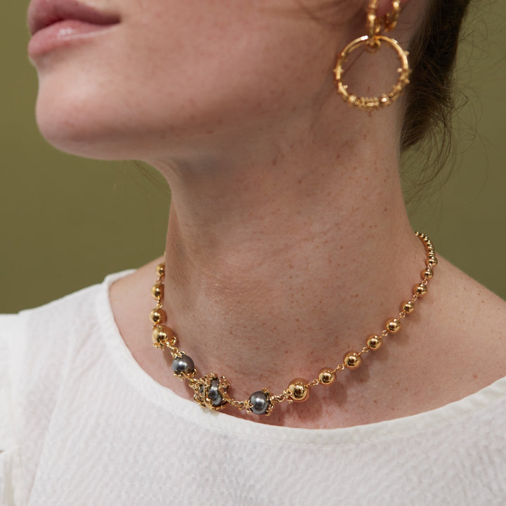 A striking necklace featuring three Swarovski dark grey pearls linked with a series of gold plated sterling silver orbs. Made in Thailand