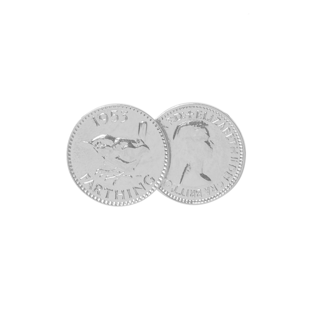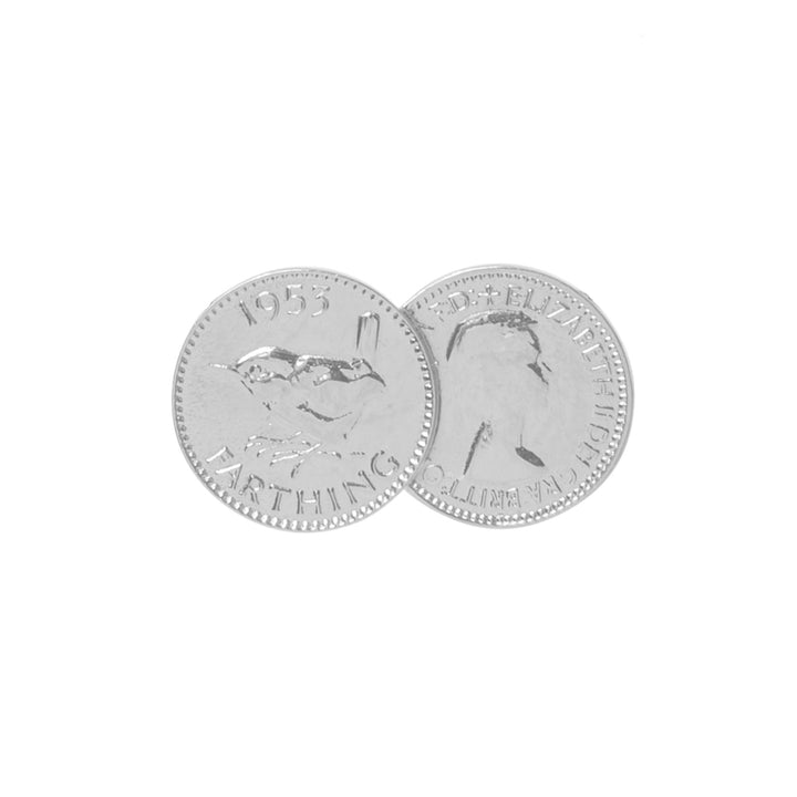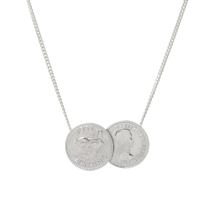A new addition to the vintage inspired Katie Mullally coin collection - the double English Farthing. A stunning silver pendant featuring two coins with a Wren on one side, and an image of Kind George VI on the reverse. A beautiful and simply British charm. The charm is collectable and can be delicately layered with other pieces.