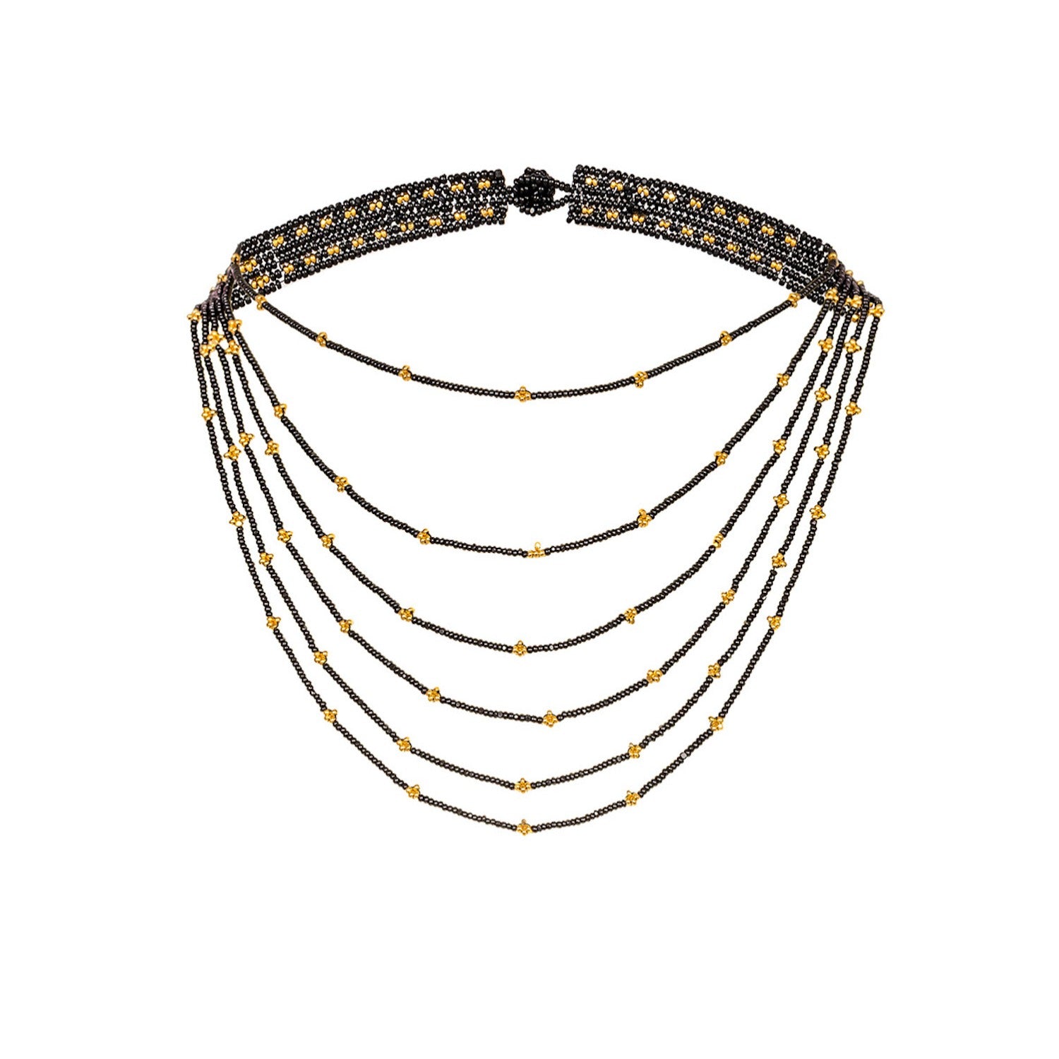 Technique that transforms centuries of tradition into art. Choker with layered straps, handmade by members of the Wixárika culture weaving more than 1,944 black, and 24k gold plated faceted crystal beads.