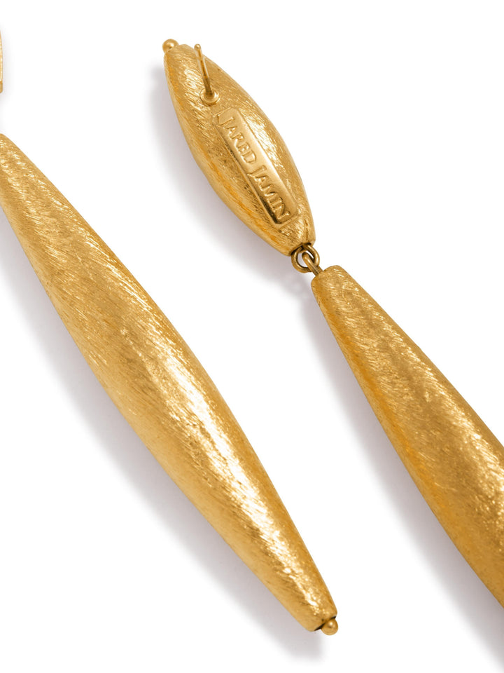 These Zeppelin Isla Two Drop Gold Earrings by Jaredjamin are an aerodynamically elegant and captivating accessory. The slim drops feature two "blimp beads" in different sizes, creating a unique and modern silhouette. This sculptural design is perfect for those who want a statement piece that is both artistic and sophisticated, bringing a touch of high-flying style to any look.