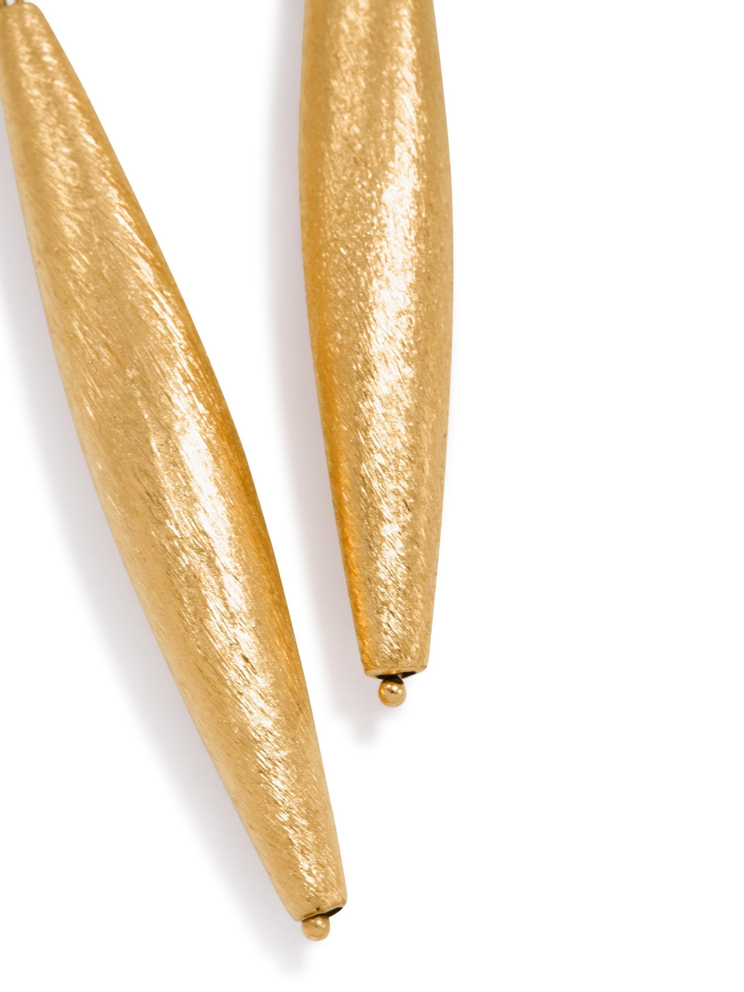 These earrings are crafted from brushed 18K gold-plated material. Each earring features a large 6cm x 9.5mm blimp bead and a small 2.5cm x 8mm blimp bead. They are 3 3/4 inches long.