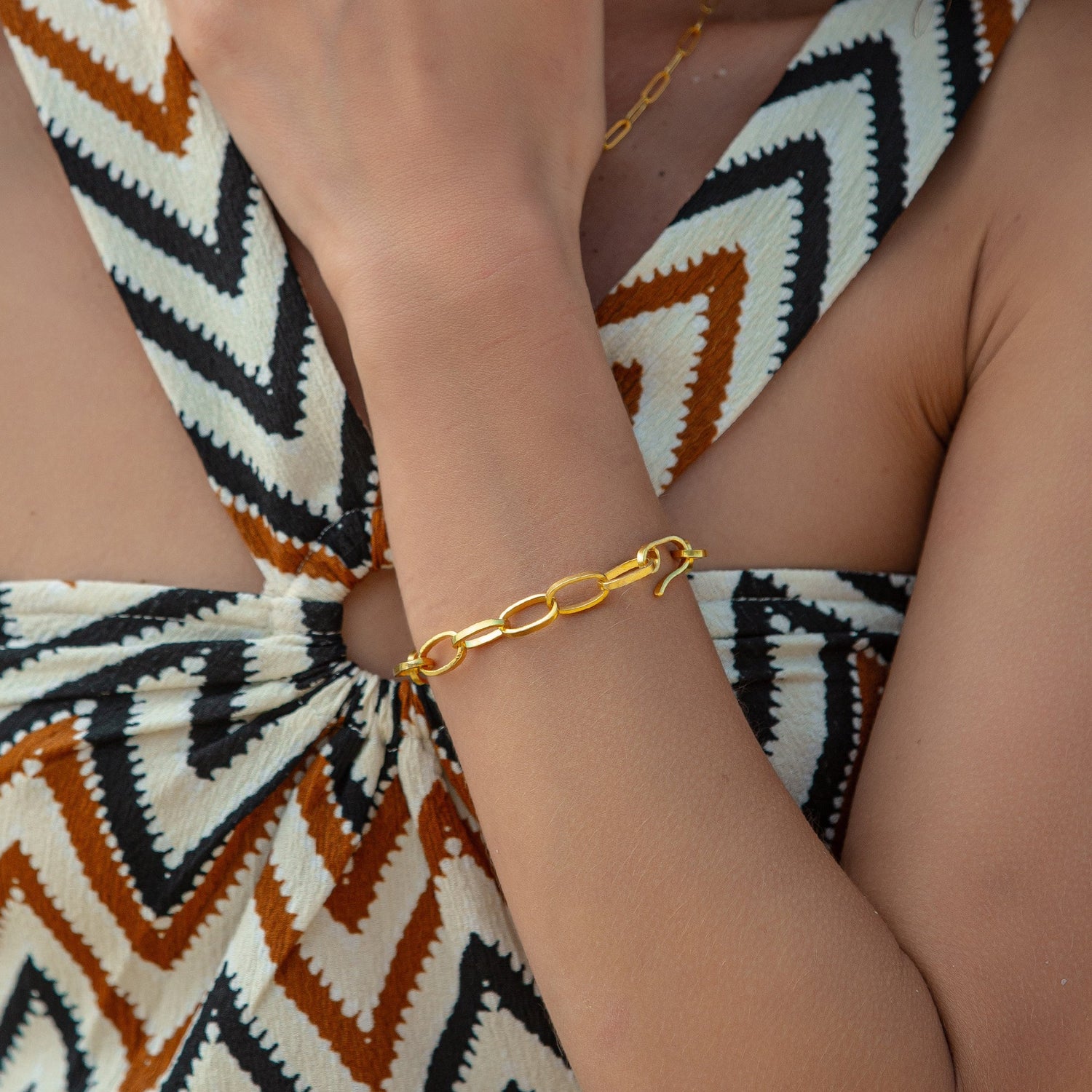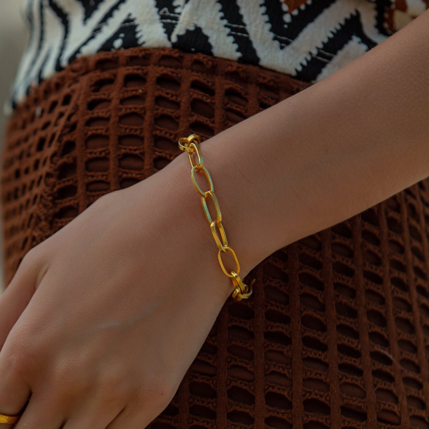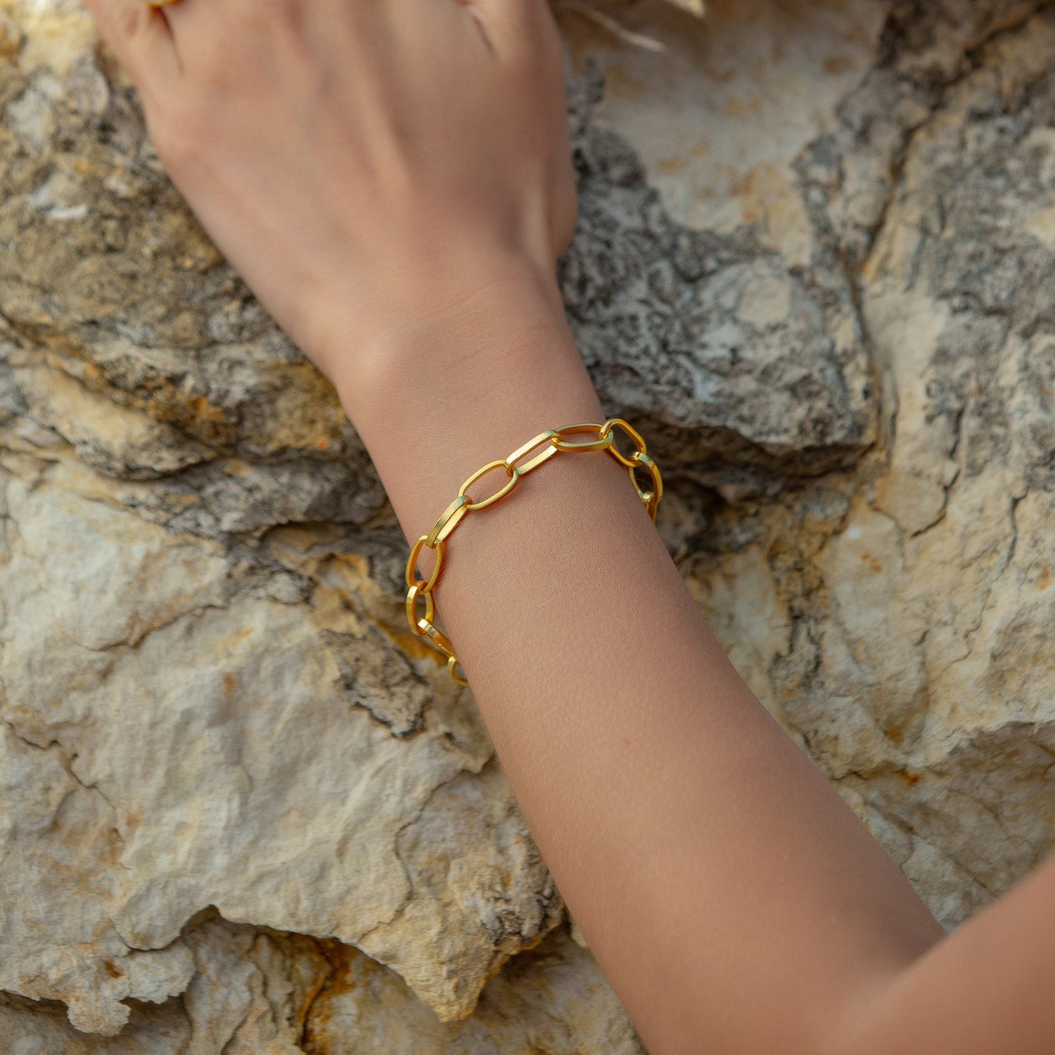 This Adjustable Large Gold Chain Bracelet by Mejoma is a bold and versatile statement piece. The stunning, large chain links create a powerful, modern aesthetic that adds a touch of luxury to any outfit. Its adjustable feature ensures a comfortable and perfect fit for all wrist sizes, making it a must-have accessory for effortless style, whether worn alone or stacked.
