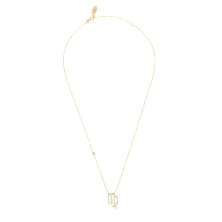 Made of 925 sterling silver, dipped in 22ct gold. This necklace is hand set with multifaceted white zircons. Virgos celebrate birthdays August 23 - September 22.Finished with a lobster clasp, and size adjuster.