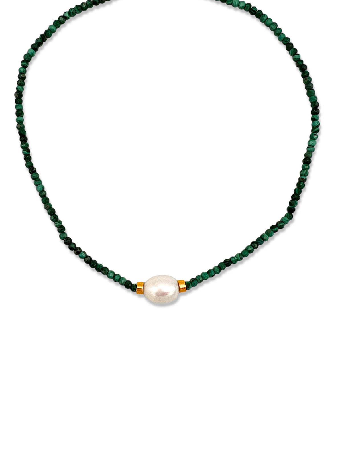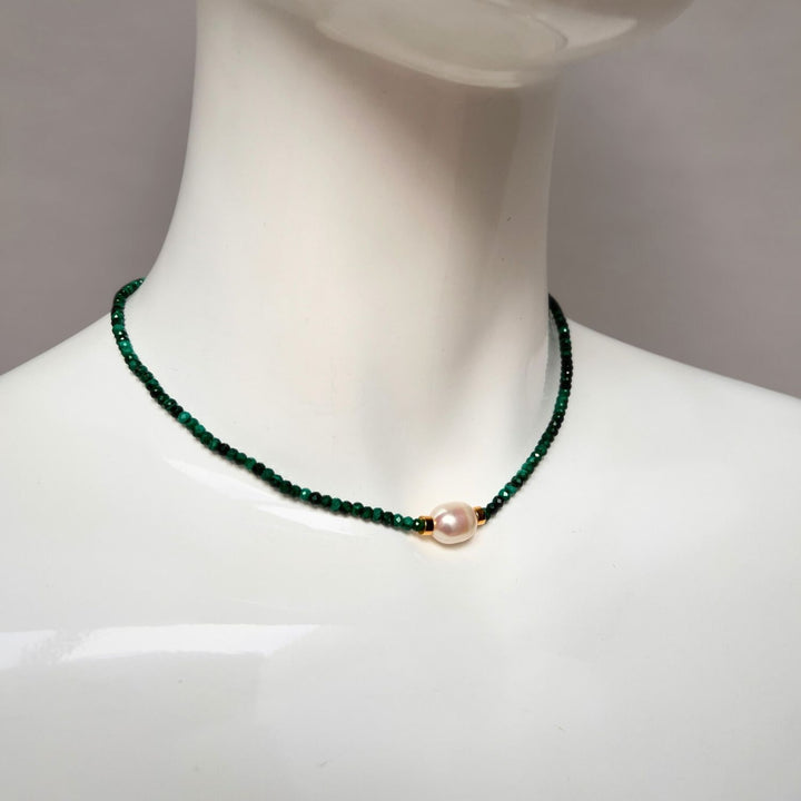 This necklace is made with 2x3mm malachite beads and a 12x10mm oval freshwater pearl. It comes in 16 or 18-inch lengths and has a lobster clasp with a 2-inch extension.