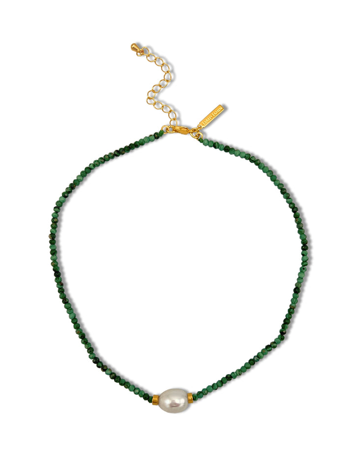 This Rowan Necklace Malachite by Jaredjamin is the ultimate layering accessory. It features 2x3mm malachite beads and a 12x10mm oval freshwater pearl, creating a beautiful and classic look. The lobster clasp and 2-inch extension make it perfect for layering with other necklaces. This piece is a perfect way to add a touch of nature-inspired elegance and sophistication to your look.