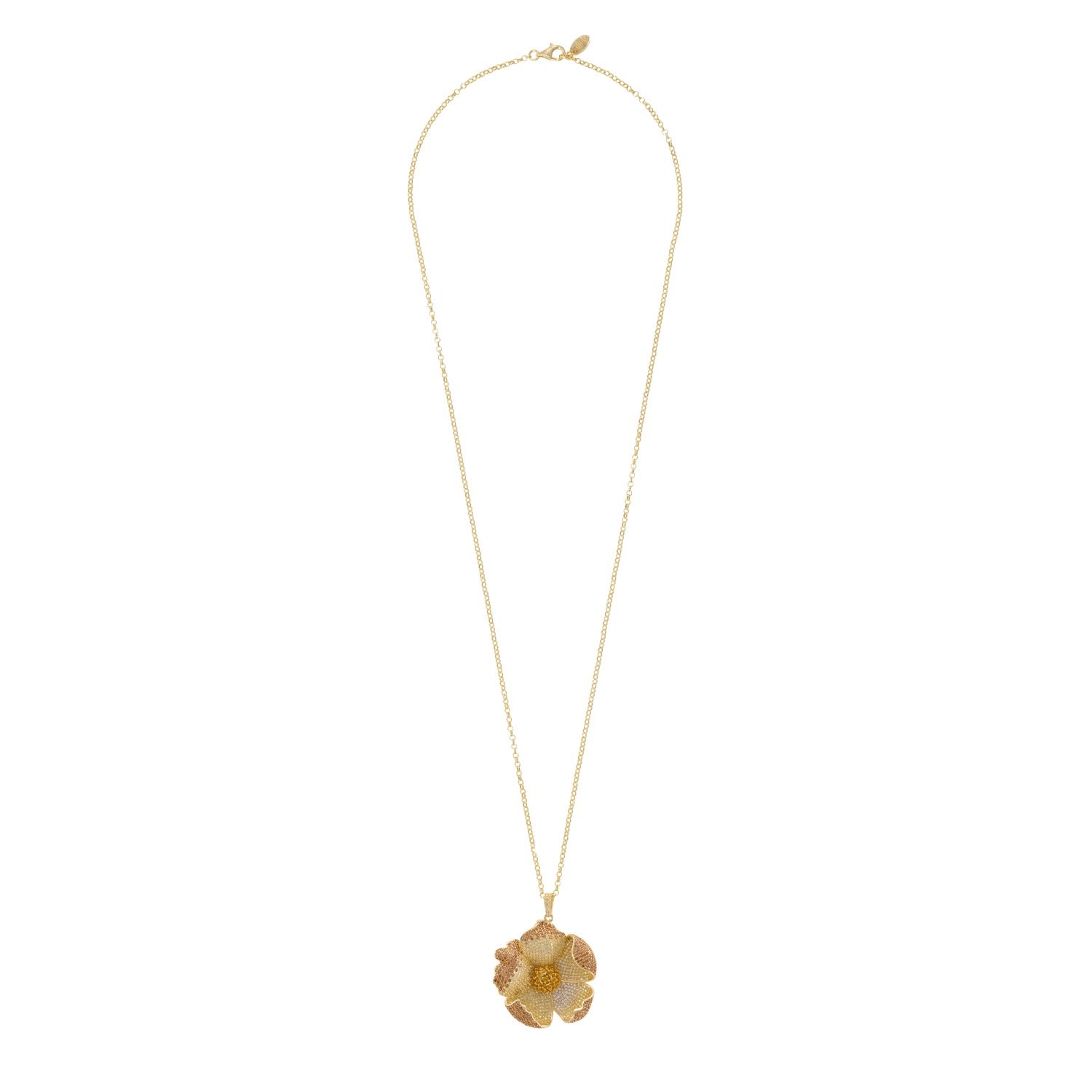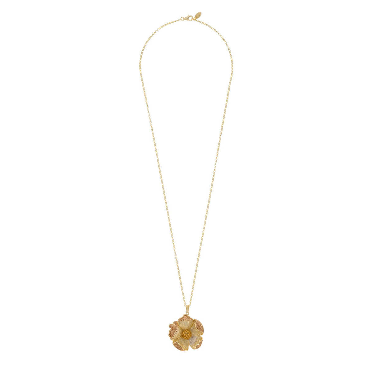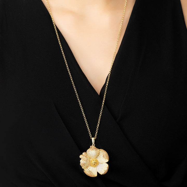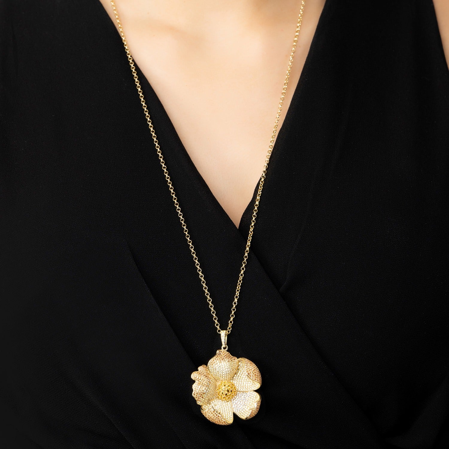 Treat yourself to the stylish Poppy Pendant Necklace Gold Lemon Cz and shake up your jewellery box in an instant. Showcasing delicate flower petals featuring a mix of vibrant lemon and subtle white cubic zirconia, you won't be able to take your eyes off it. Not only is this piece absolutely stunning, but the three-dimensional poppy design adds major interest and individual style to any outfit. Whether you're looking for a statement accessory or something more subtle, this necklace has got you covered. It's easy to wear comfortably all day long. Poppies are symbols of sleep and regeneration, on a spiritual level, poppies symbolize the eternal life of the soul, including reincarnation. Yellow poppies are said to symbolize wealth and success.