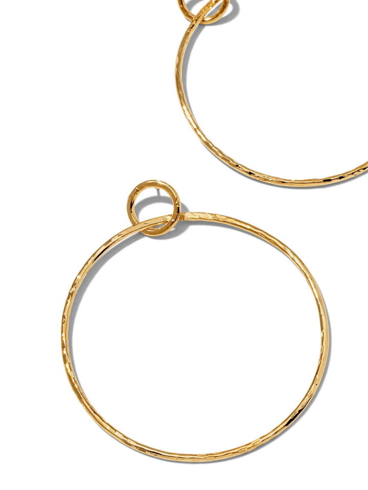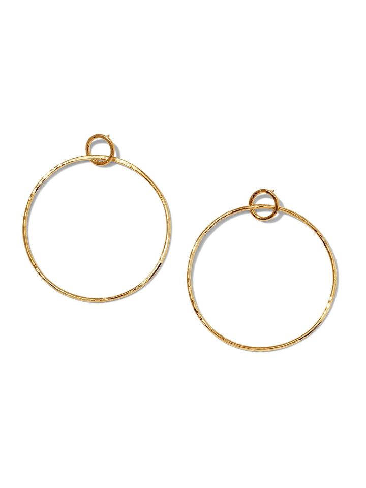 These hoop earrings are crafted from brass with an 18K gold plating. They feature a hammered texture and have a post fastening. The drop is 3 inches.