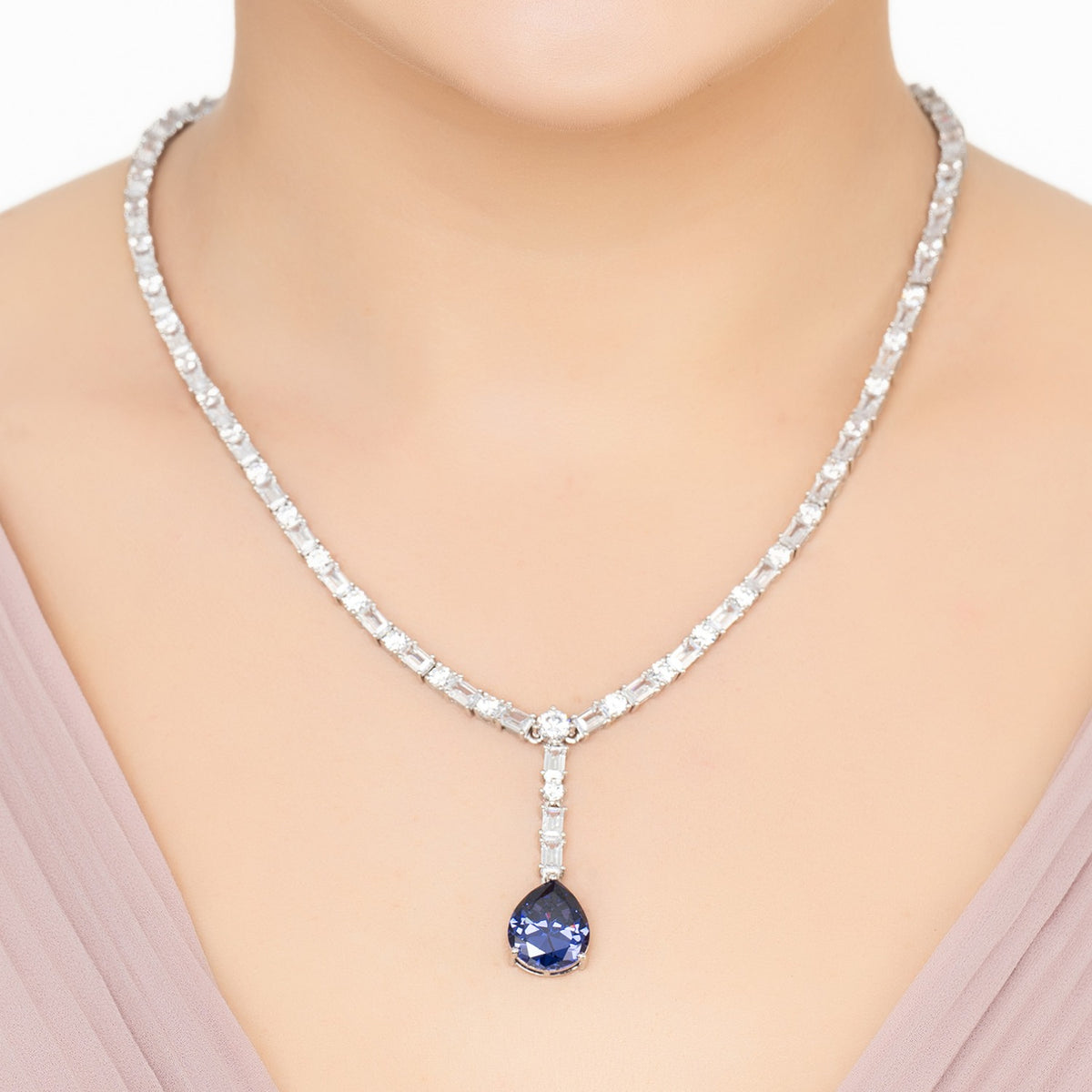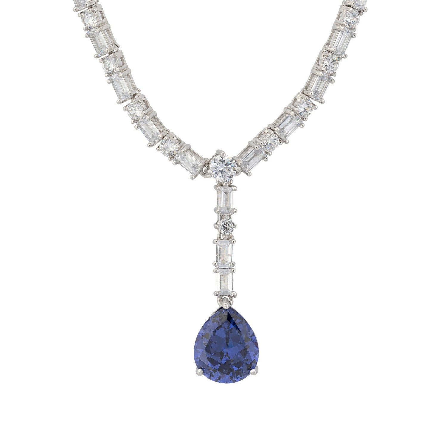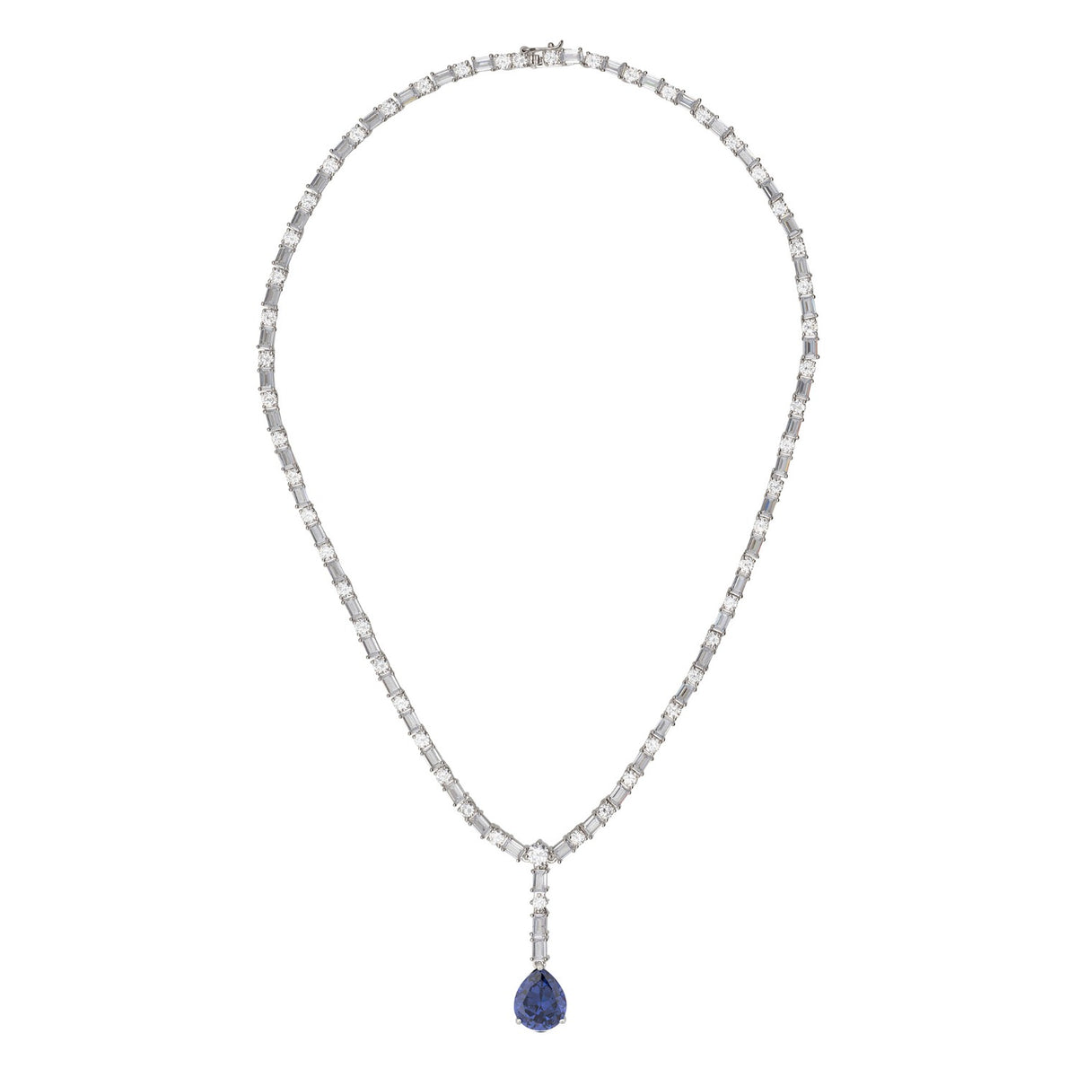 Introducing the Claudette Statement Necklace featuring Tanzanite, a true embodiment of elegance and charm. This exceptional piece, crafted with precision, offers a sophisticated flair. The necklace is enhanced by a lab-grown Tanzanite teardrop gemstone. The captivating blue-violet hue of Tanzanite, celebrated as the birthstone for December, adds a unique and personal touch, symbolizing wisdom and dignity. This necklace is beautifully adorned along its entire length with alternating baguette cut and round simulated diamonds.
