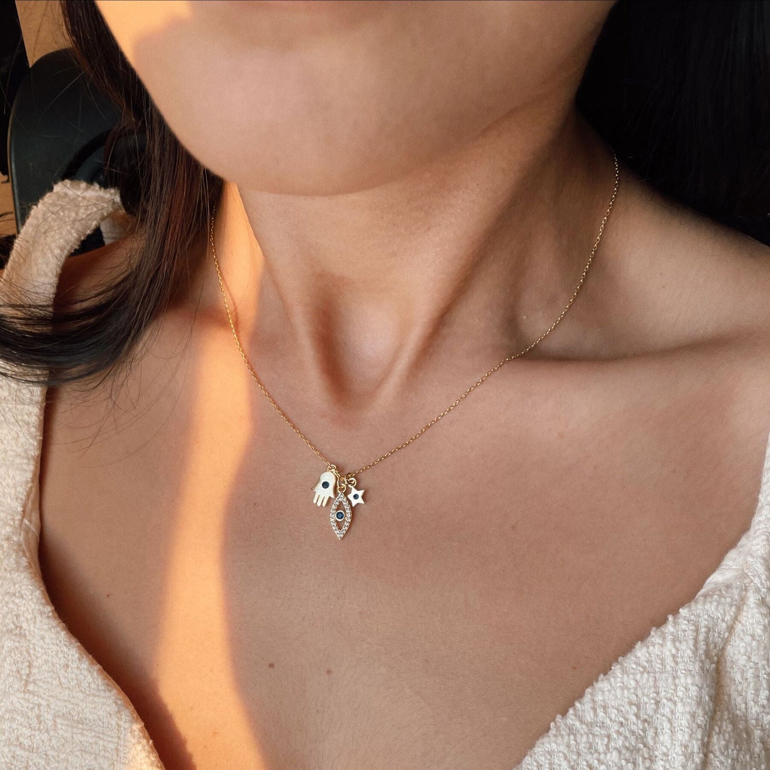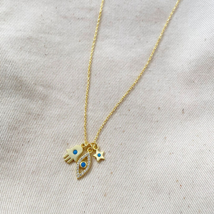 This necklace is crafted from sterling silver and features a hamsa evil eye star design with turquoise accents.