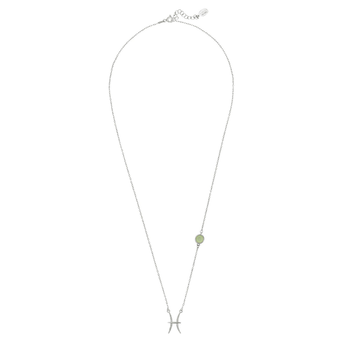 Dive into the depths of Pisces mystical realm with the Zodiac Pisces Birthstone Necklace Aqua Chalcedony Silver. Pisceans celebrate their birthday Feb 19- Mar 20.This zodiac necklace features the fishes' constellation set with sparkling cubic zirconia highlights, complemented by a serene lab-created Aqua Chalcedony set along the chain. This piece embodies the fish's intuitive and compassionate spirit, with Aqua Chalcedony bringing calm and reflection, perfect for navigating the emotional waters of the horoscope.