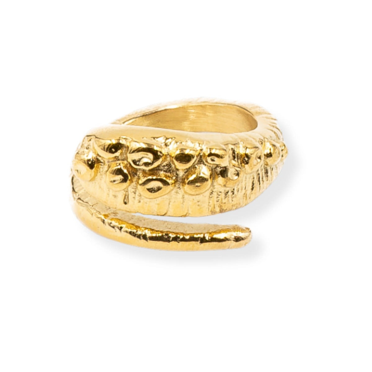 This Ondaluz - Octopus Ring Gold by Martina Rozenberg Smira Jewelry is a beautiful tribute to the ocean's mysterious grace. The hypoallergenic ring is crafted with fluid, tentacle-like curves, echoing the elegance of the deep. Its 24k high-quality plating ensures a lasting shine, while the durable stainless steel base offers high resistance to corrosion and scratches. This ring captures the untamed spirit of the sea and adds a striking, unique touch to your style.