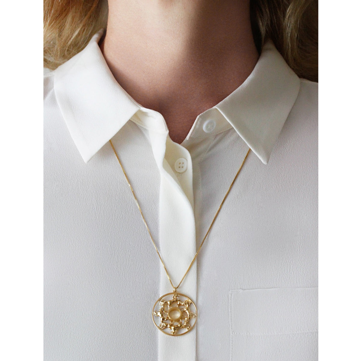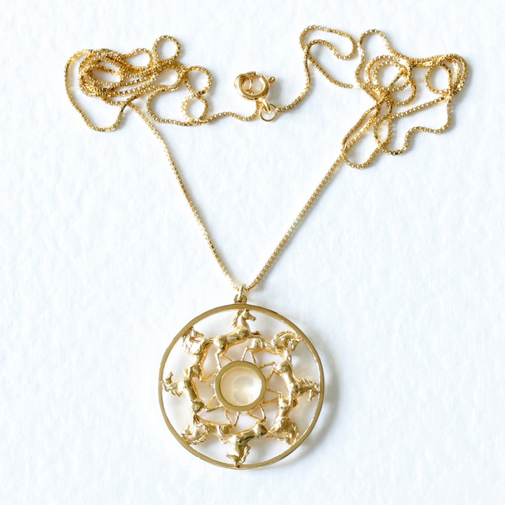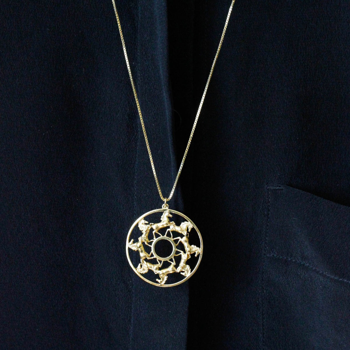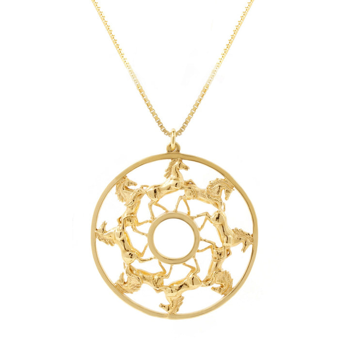 Our beautiful wild horses medallion necklace is exquisitely detailed, showcasing these magnificent animal’s power and movement. It features 8 horses, all intertwined in a wave-like formation, racing around the medallion pendant. Wild horses symbolise freedom, travel, intuition, and adventure –perfect for embracing your wild side. Horse pendant sits on a delicate 22” mirror box chain to add a bit of sparkle to the whole piece.