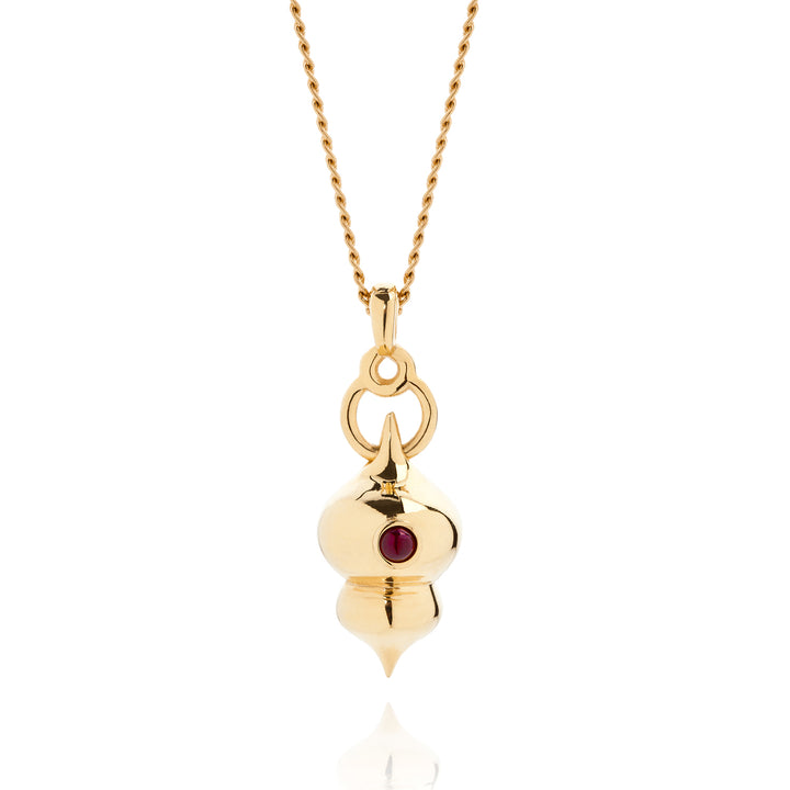 The feminine forms and sensual curves in this pendant work beautifully with the bright red ruby – and very wearable day or night. The pendant hangs from an intertwined looped shape and moves independently of the pendant. Chain is made in silver and pendant in Italian brass, all generously overlaid with 18ct gold and set with a red ruby.