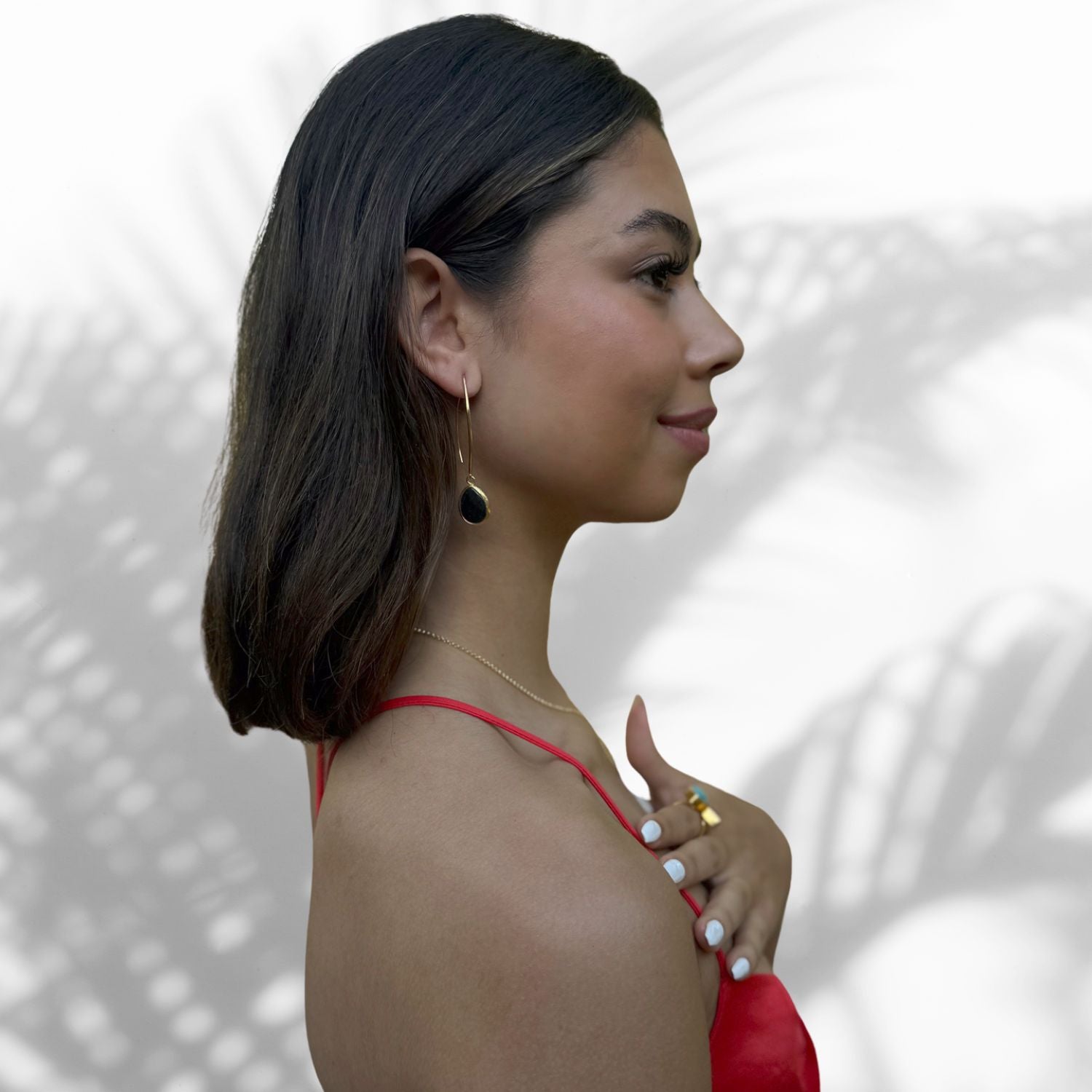 These earrings are made of 18K gold-plated brass and feature black onyx stones. To maintain their shine, wipe them gently with a jewelry polishing cloth and avoid contact with chemicals and abrasive cleaners.