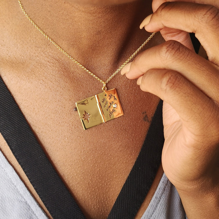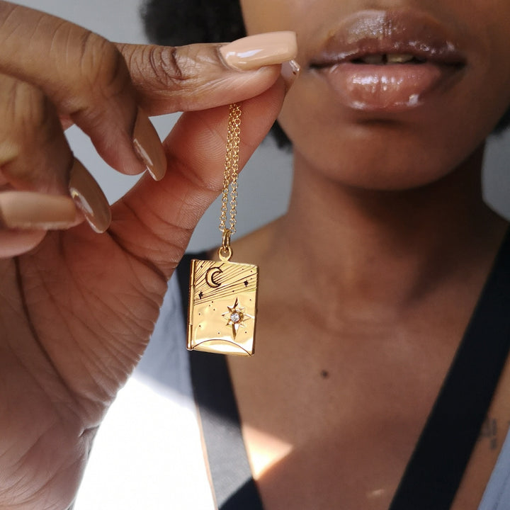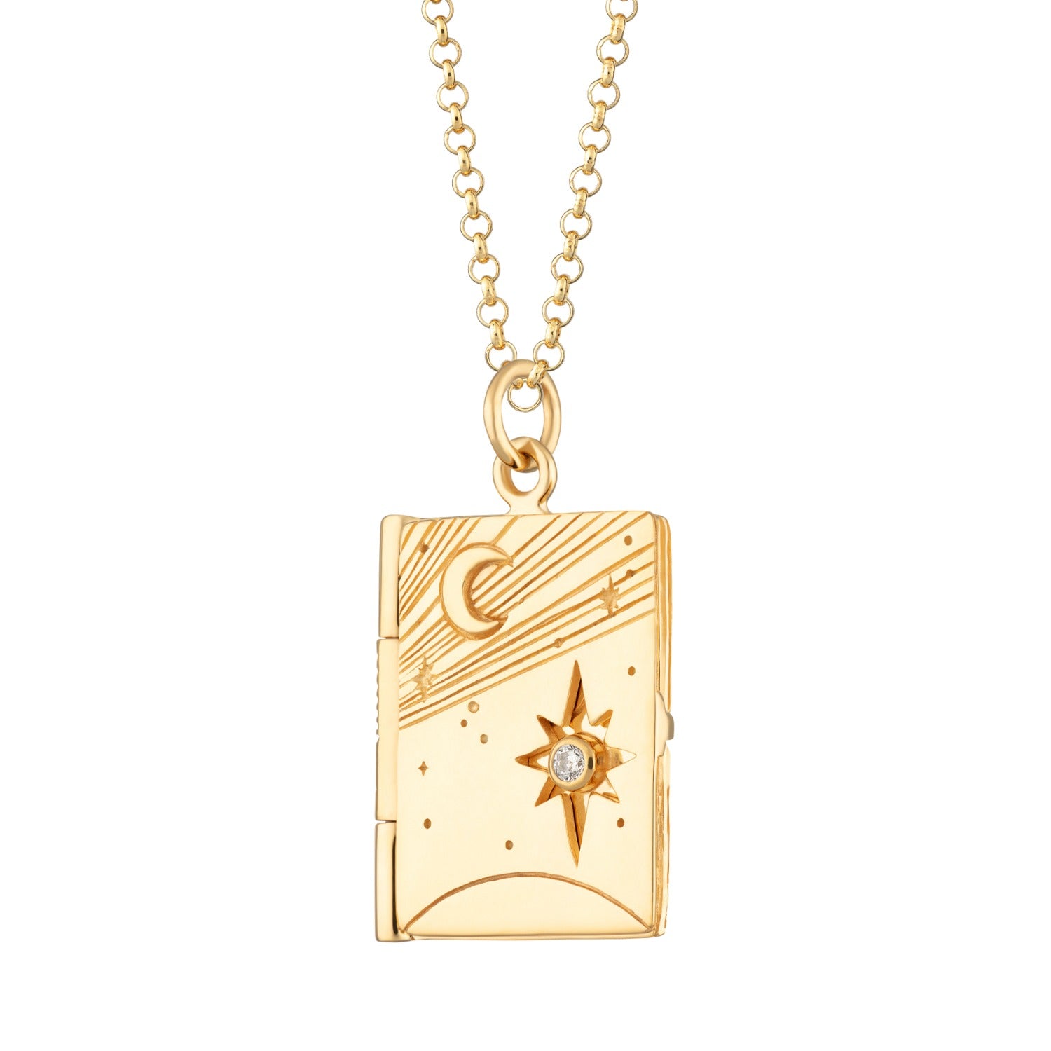 Let your star shine with this gorgeous 18ct gold plated sterling silver celestial locket charm necklace! Intricately designed to depict a mystical starry night sky for a stunning cosmic scene. Crafted from sterling silver this luxurious constellation locket opens up like a book to reveal a ‘we are all made of stars’ engraving, and has been polished for a high-quality shine. Standing strong the north star dazzles with a faceted clear cubic zirconia stone that always glistens whether this locket is closed or open. With a little guidance from the stars, this astronomy celestial locket adds a sense of wonder and passion for adventure to your charm jewellery collection.