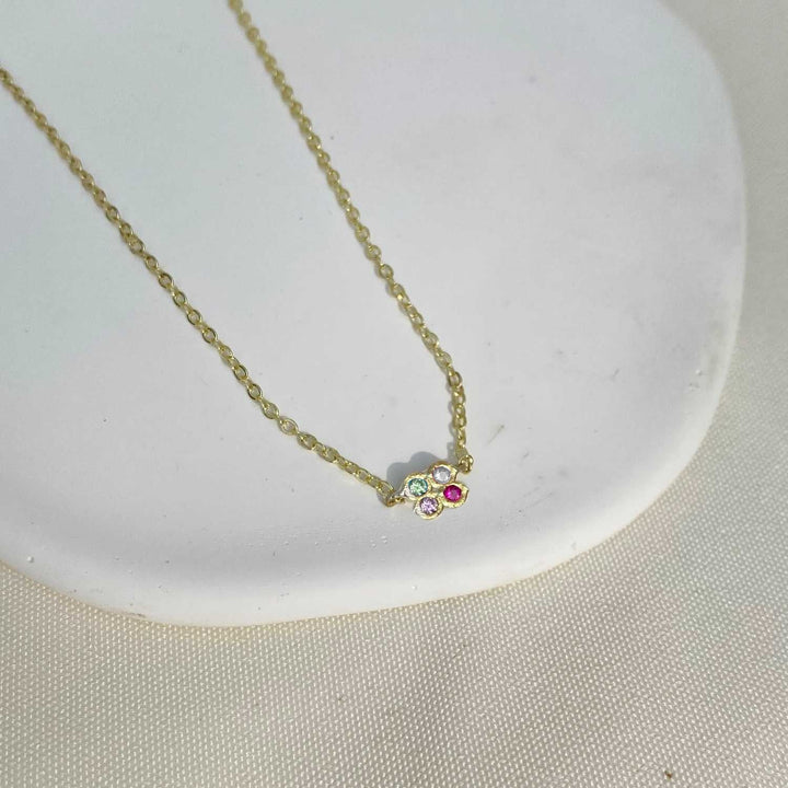 With their diamond bright and good-time vibes, this Disco Cube Necklace is a playful, modern necklace sure to uplift your day like your favorite dance track. The gold bezels are crafted together to create a delightful pretty pattern and attached to a lovely diamond cut belcher chain to let the color shine through. Elegant, minimal, and offering pretty sparkle, this necklace is your everyday necklace or as an addition to a cool layering set. The whole collection is designed around color, so pick which colors and gemstones you like.. we are here to create joyful jewelry for you - so if you have a special request, just ask us.