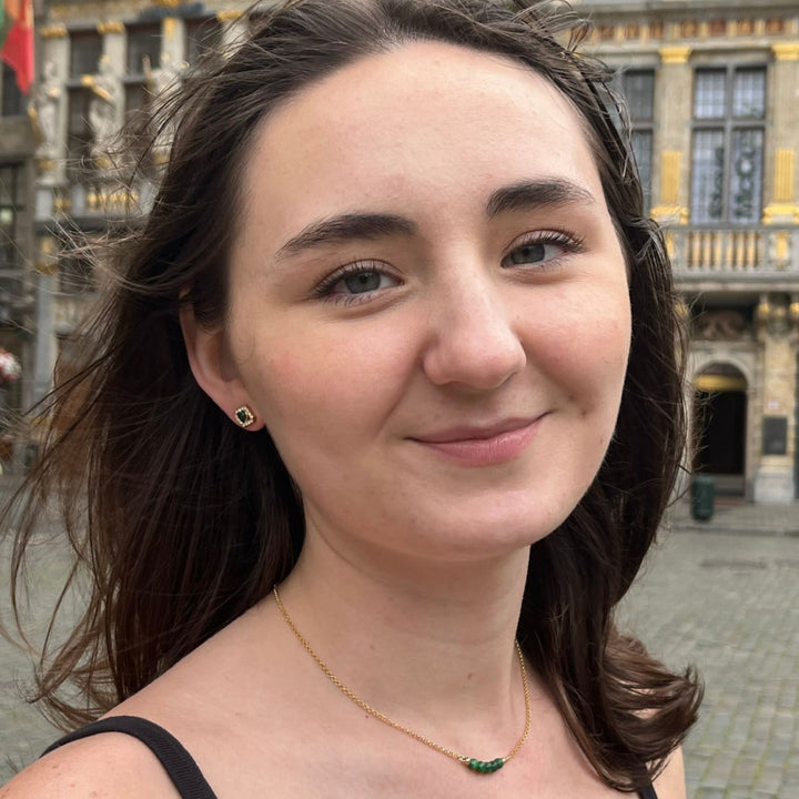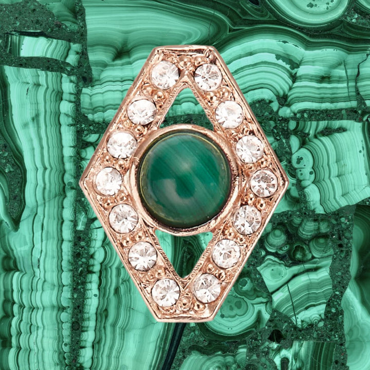 These Crystal & Malachite Gold Earrings, Series Gem Flakes by Grossé radiate timeless luxury. Each earring features a genuine malachite cabochon, its unique patterns framed by a diamond-shaped design glittering with Czech crystals. The harmony of green malachite and sparkling gold-plated detail evokes nature’s elegance with modern sophistication, making every pair one-of-a-kind.