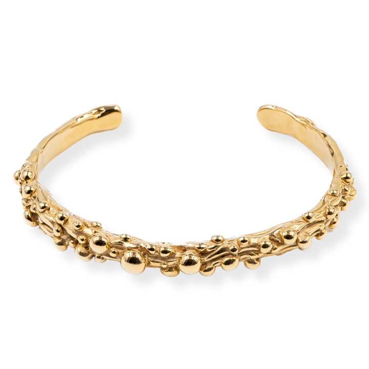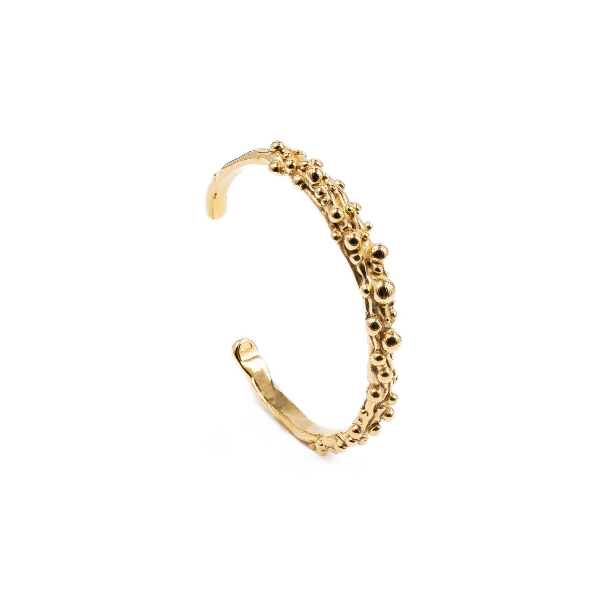 This cuff is made from hypoallergenic stainless steel with a gold finish and features fluid, bubble-like forms. The gold version is 24k high-quality plated.