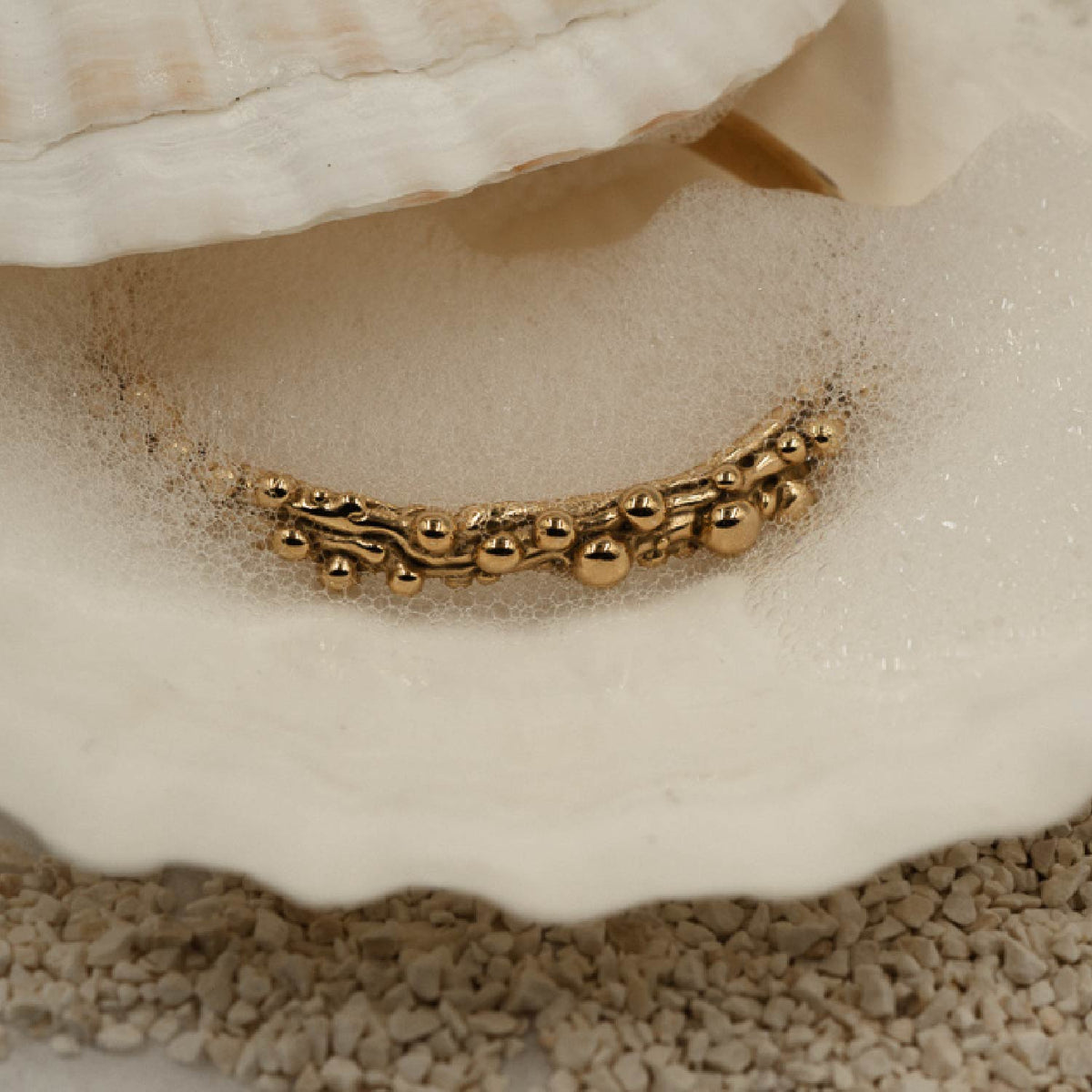 This Ondaluz - Triton Cuff Gold by Martina Rozenberg Smira Jewelry is a unique and fluid accessory that pays tribute to the ocean’s ever-changing dance. The hypoallergenic cuff is designed with fluid, bubble-like forms that echo the fleeting beauty of sea foam. Its high-quality stainless steel construction ensures it is highly resistant to corrosion, scratches, and wear. This cuff is a stylish and lasting piece that captures the essence of waves in motion.