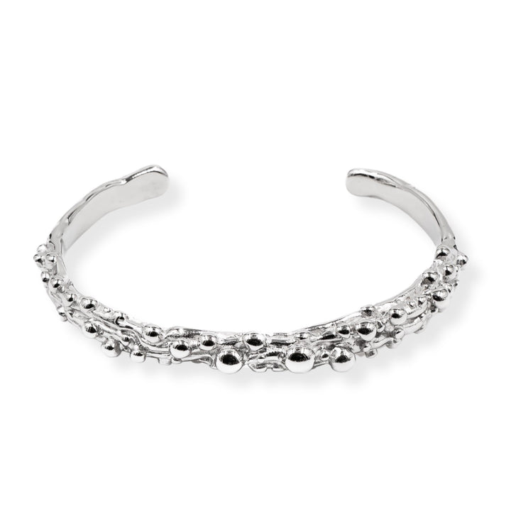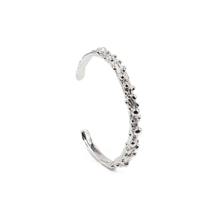 This cuff is made from hypoallergenic stainless steel with a silver finish. It features fluid, bubble-like forms.