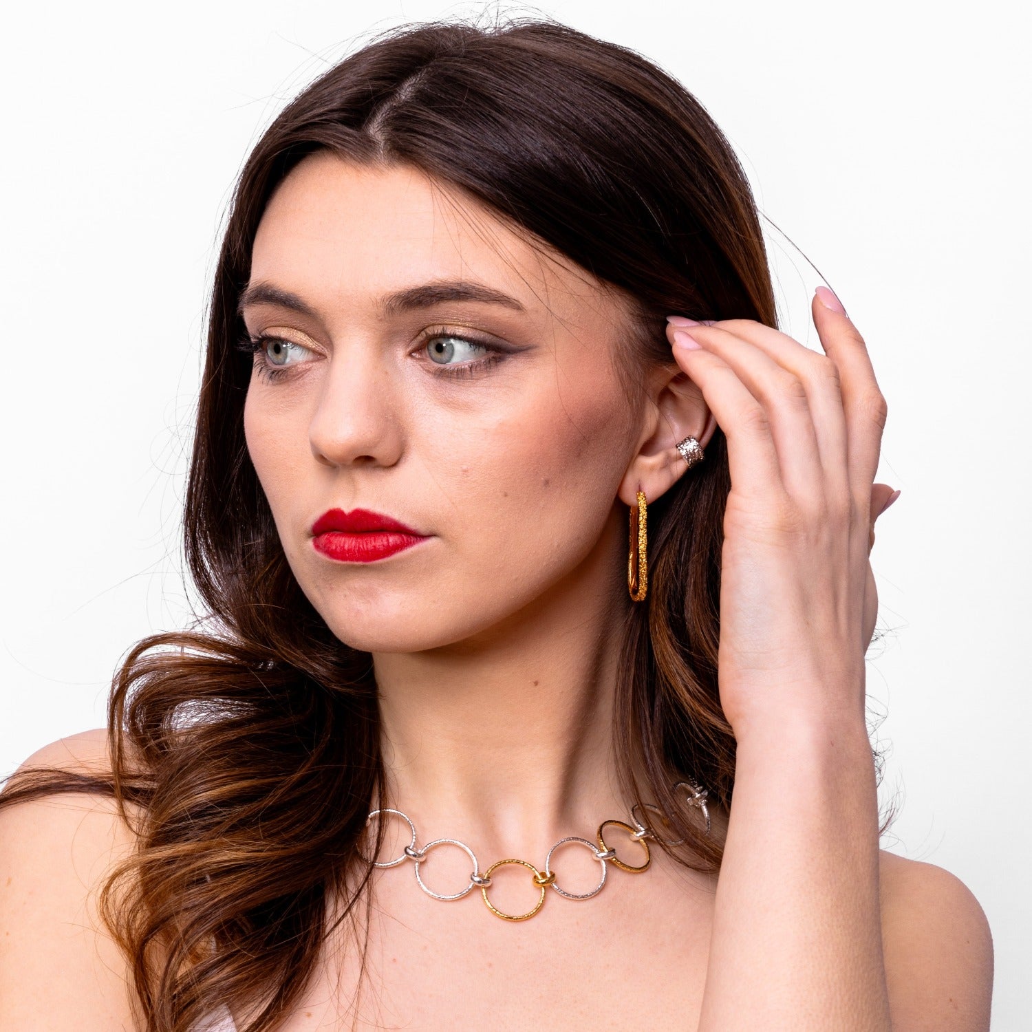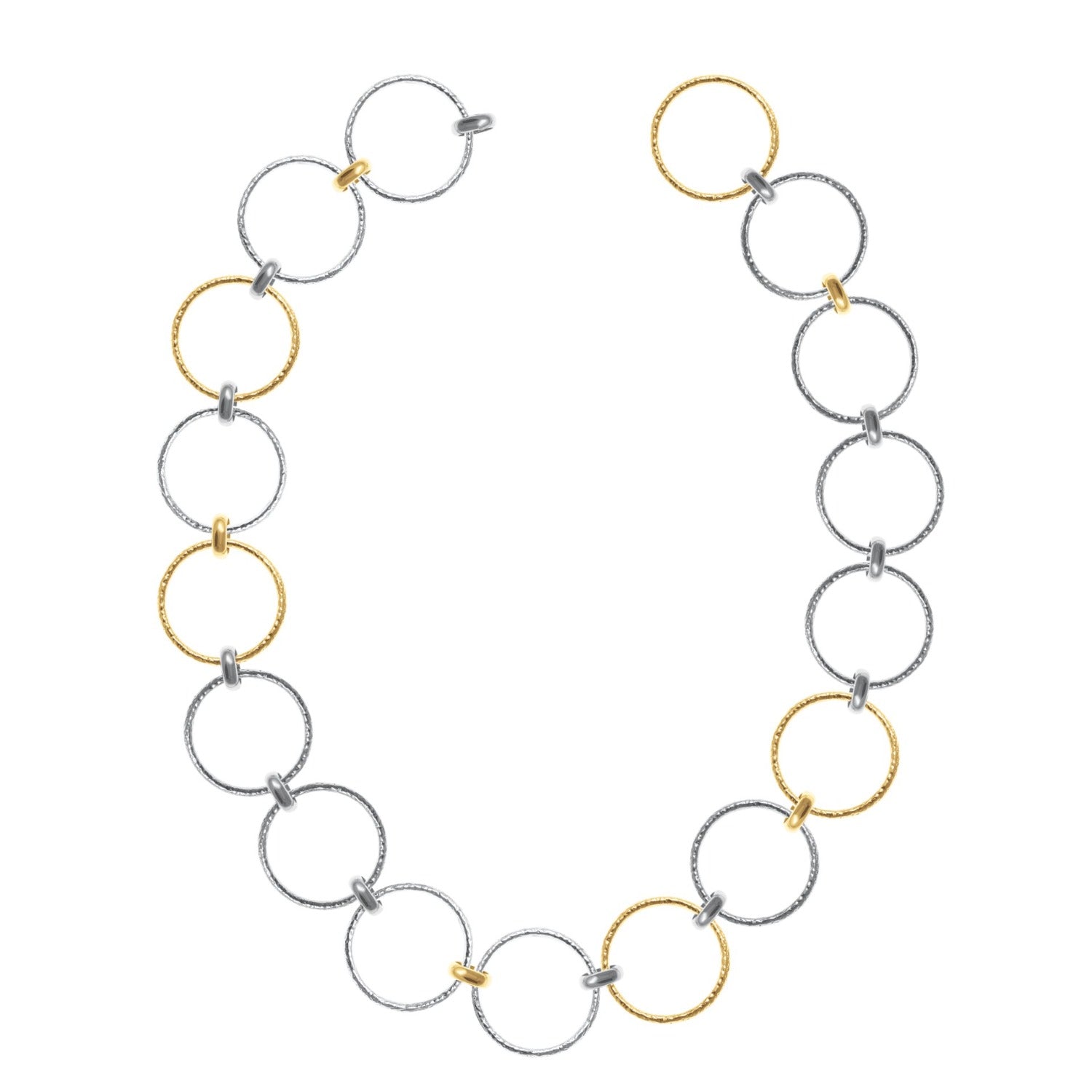 The Multi Finish Hula Necklace in Sterling Silver and 18ct Gold Vermeil is a refined accessory that combines the timeless elegance of silver with the luxurious charm of gold. Its hula hoop-inspired design, adorned with multiple finishes, adds a touch of sophistication to any outfit. Whether worn solo for a statement look or layered with other necklaces, this piece effortlessly elevates your style with its versatile appeal.