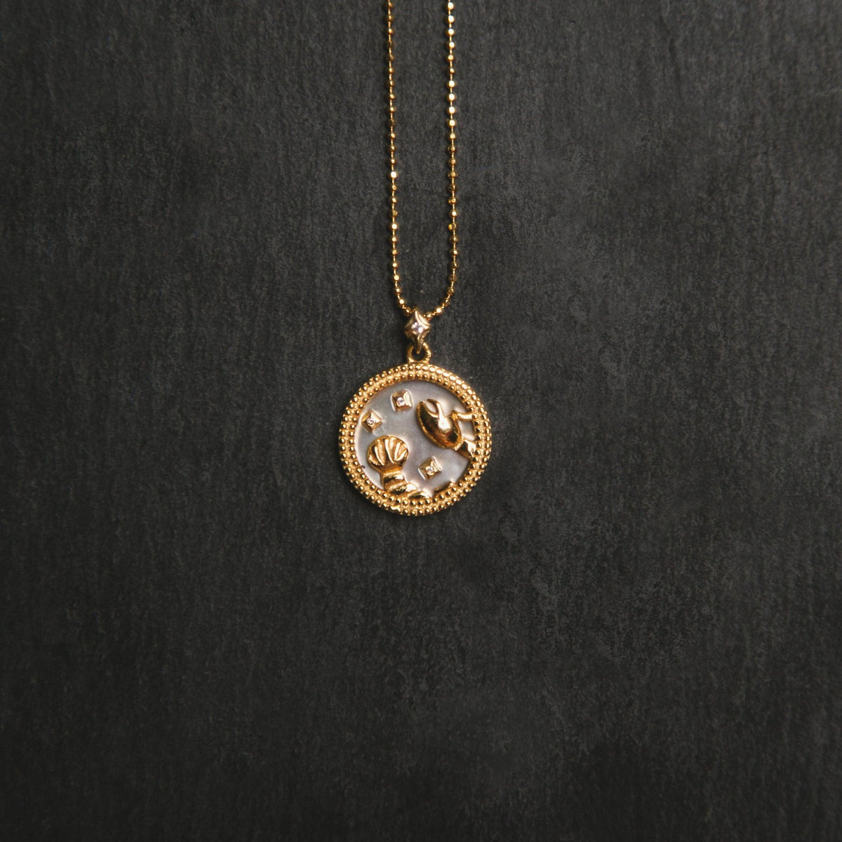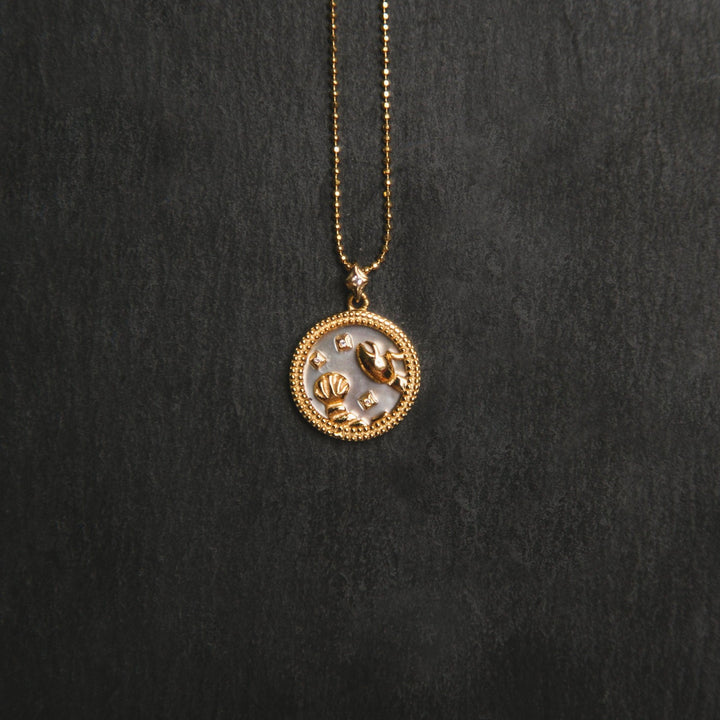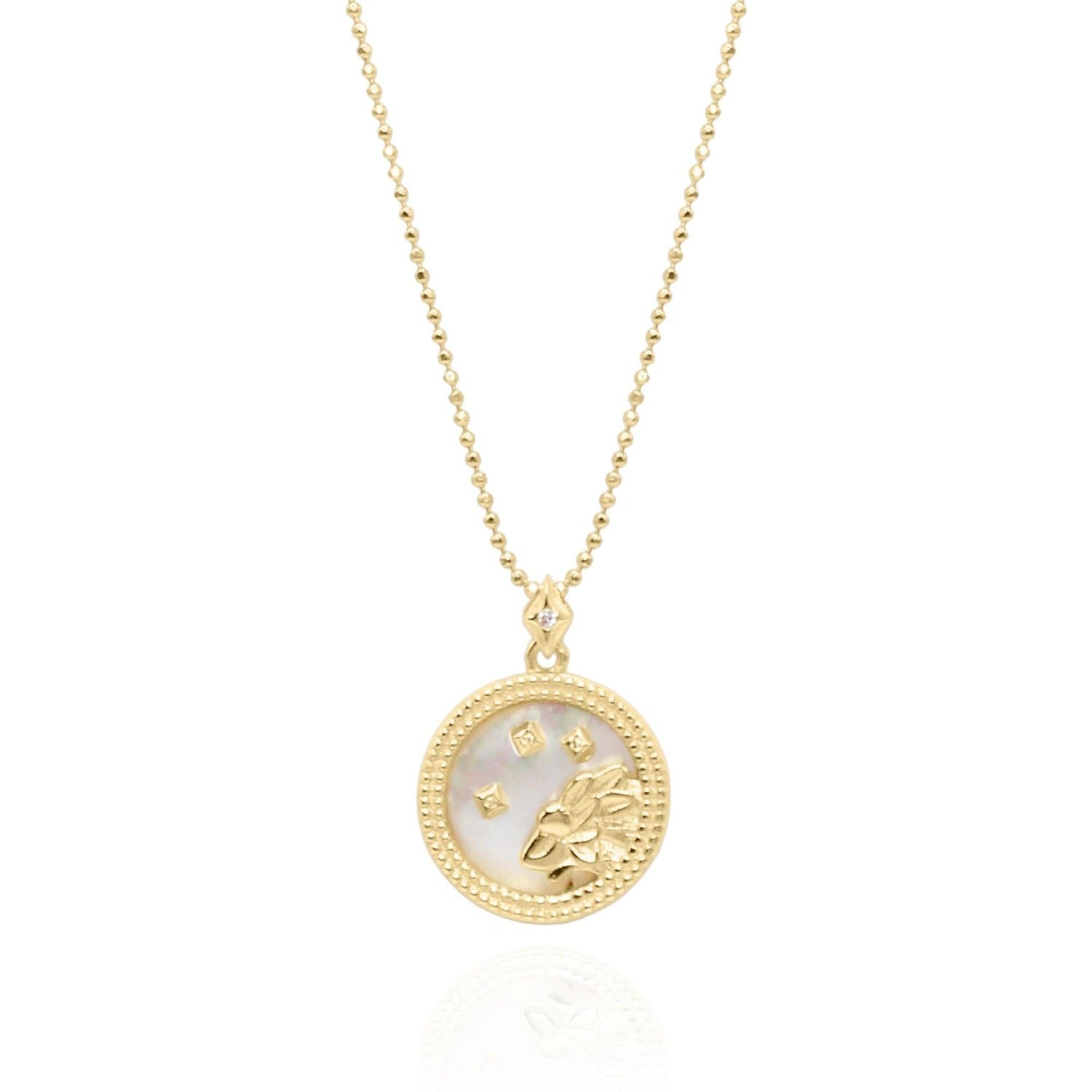Style Notes: What's your sign?... ;) Embrace your horoscope with our unique Asta Necklace. This gold plated Star Sign necklace has a coin pendant with detailed cut-out zodiac emblem for each astrological constellation on a gorgeous mother of pearl background.