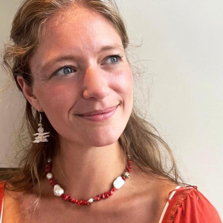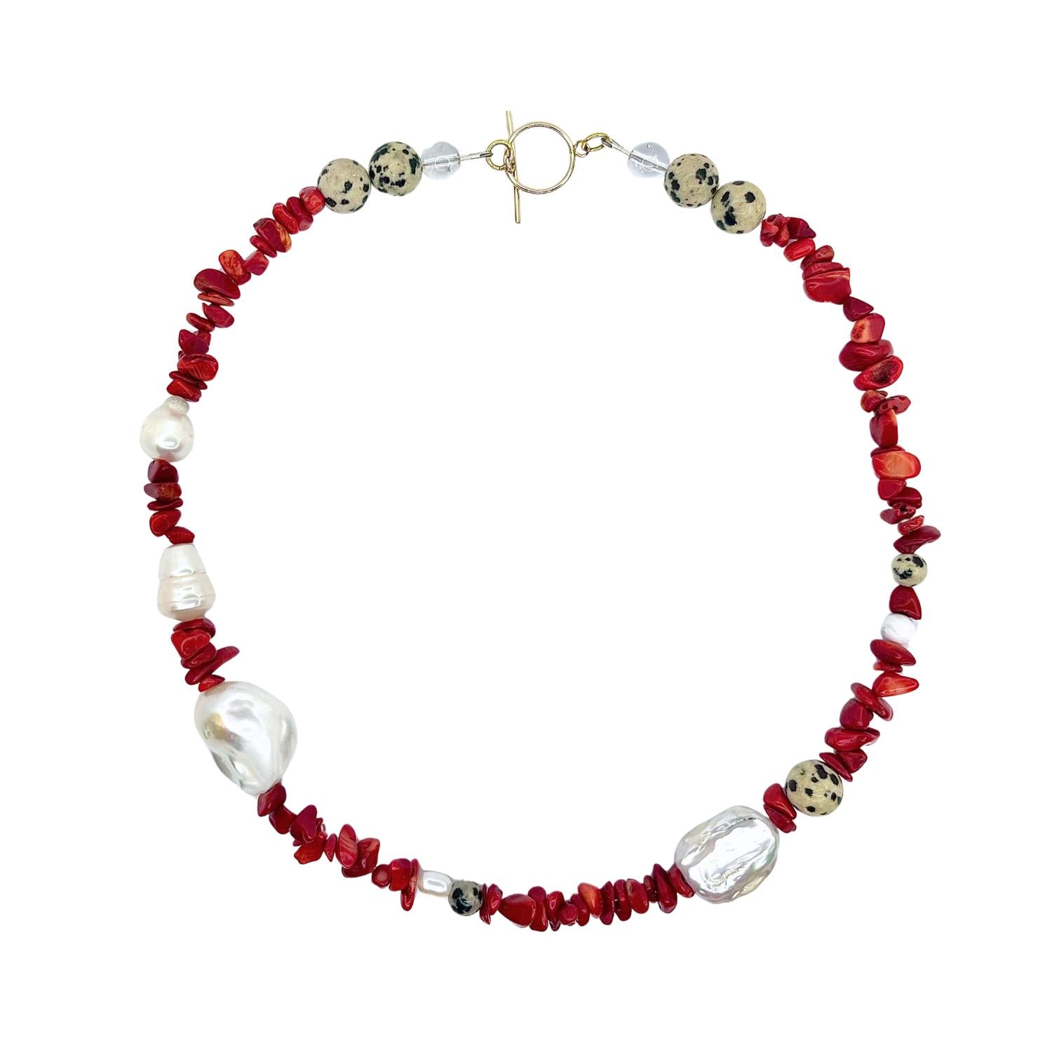 The Ares, a bold and unique necklace bamboo red coral, baroque pearl and dalmatian jasper necklace is designed to exude confidence. Pair it with a sleek black dress for a striking contrast or with a white blouse for a chic, contemporary look. Its versatile design and striking appearance make it an essential addition for both modern and classic styles. As each pearl is unique, every piece is different and yours. Named after the God of war and courage. 925 sterling silver toggle clasp Baroque pearl, River pearl, Keshi pearl & Freshwater pearl, Red Coral, Dalmatian Jasper, Clear Quartz 925 Sterling silver clasp