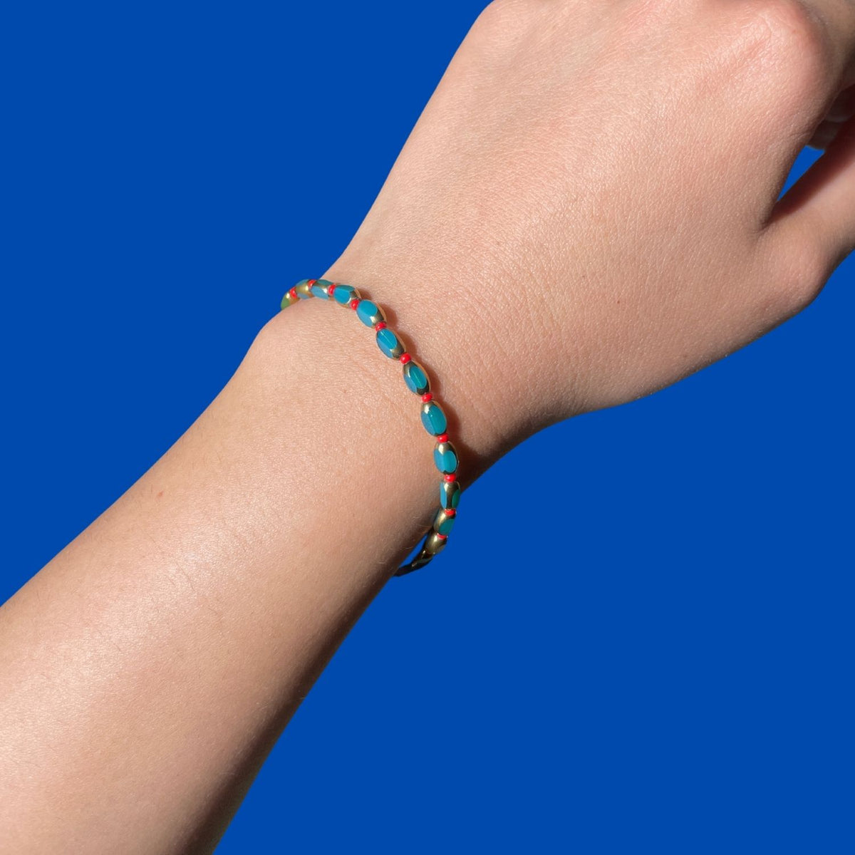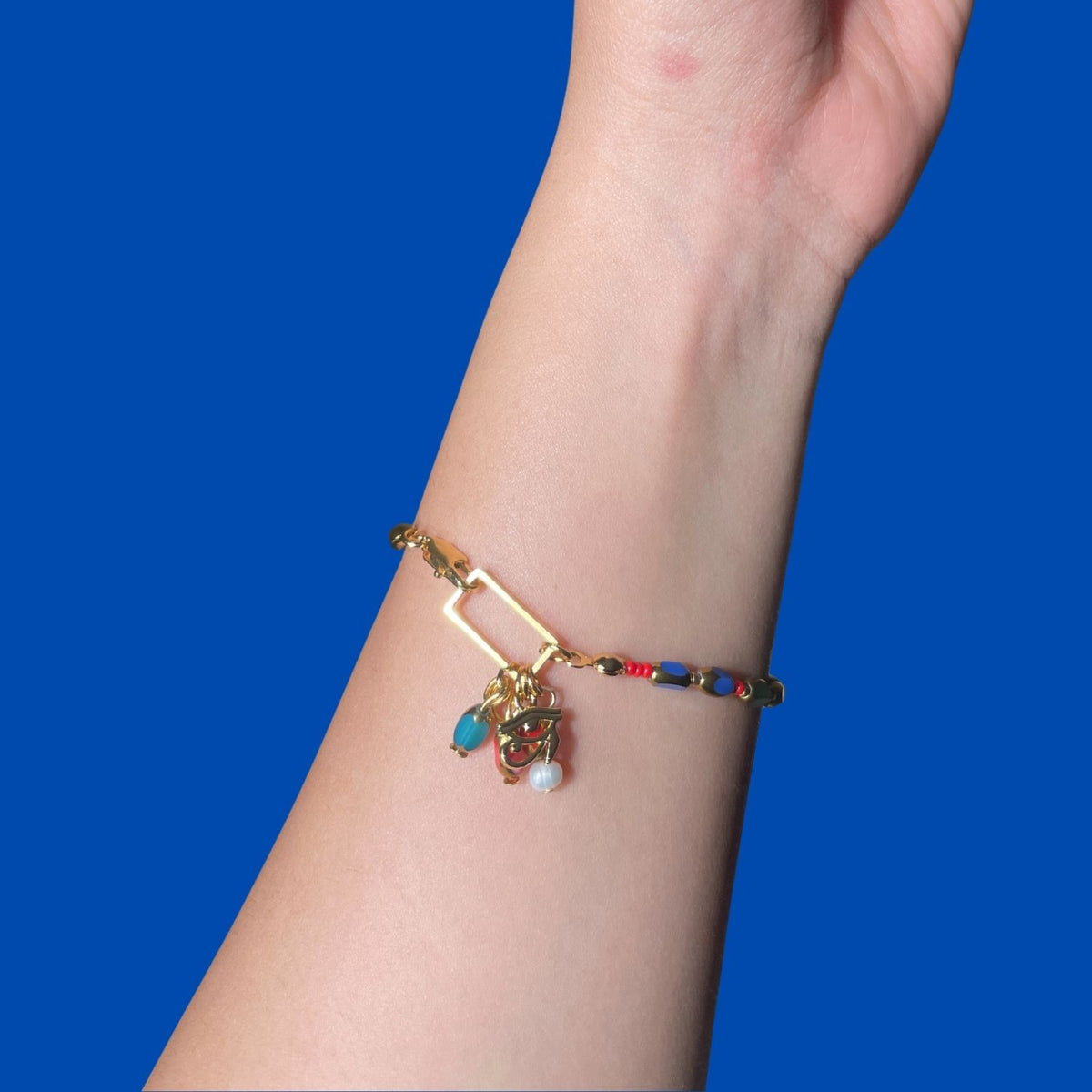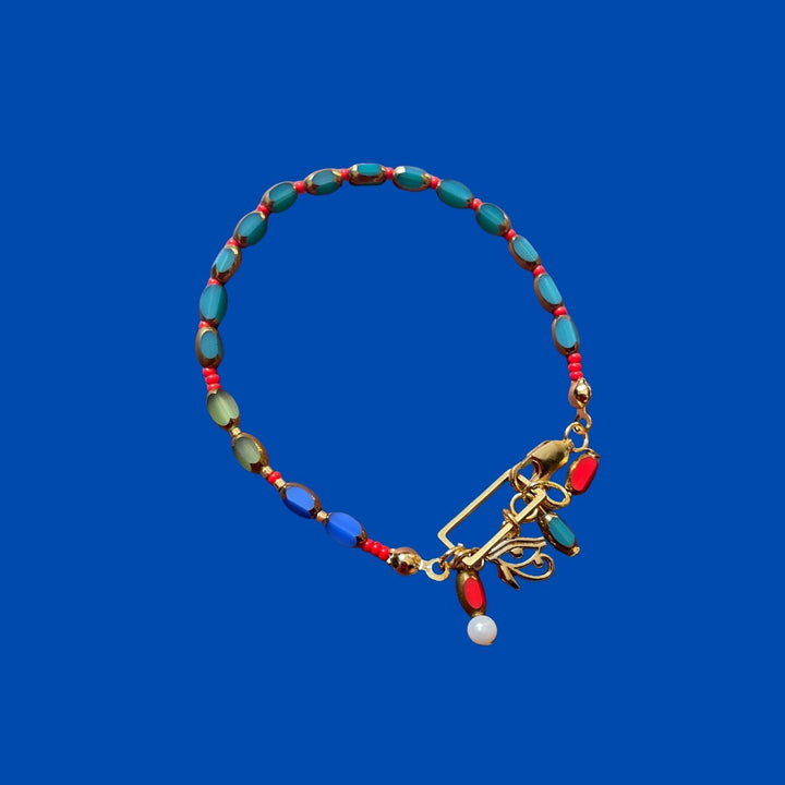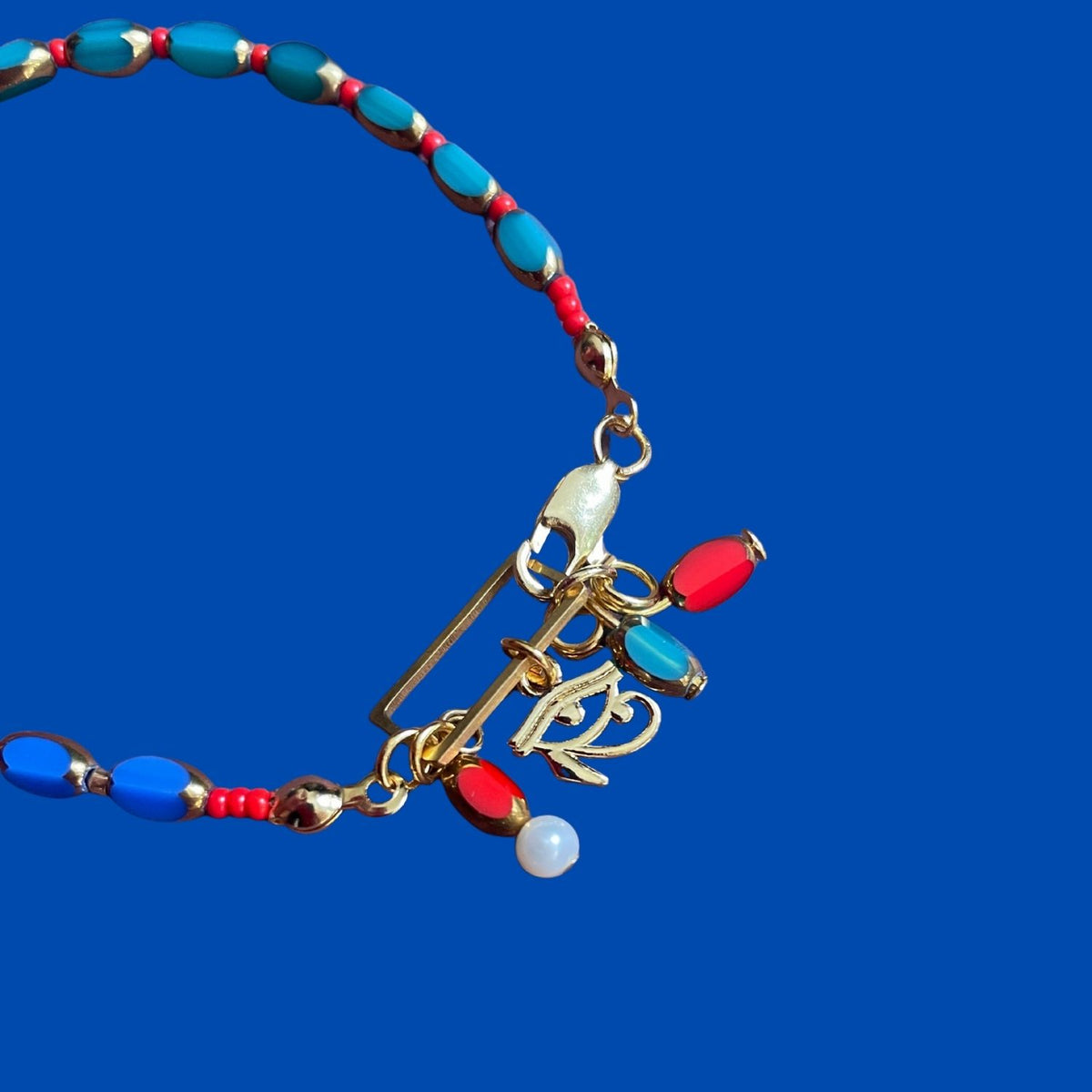 This Nile Blue Handcrafted Egyptian-Inspired Beaded Bracelet by Desert Lobby is a work of art, combining the rich, fiery red and deep blue-green of ancient waters and sacred Egyptian temples. Each bead is individually shaped and crafted by hand, giving every piece a unique and authentic feel. The bracelet features a mystical Eye of Horus charm, a timeless symbol of protection and good health. A tiny, luminous pearl at the clasp adds a delicate, organic touch, making this a perfect accessory for those who appreciate history and artistic expression.