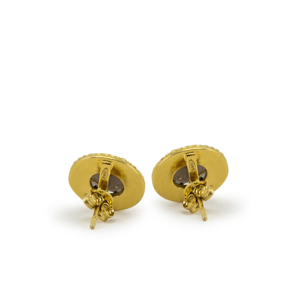 These stud earrings are cast from solid 18-karat gold over sterling silver with a 1-micron thickness. They are centered with 3.0-carat smoky quartz stones that are hand-set in a twisted setting, and are nickel-free.